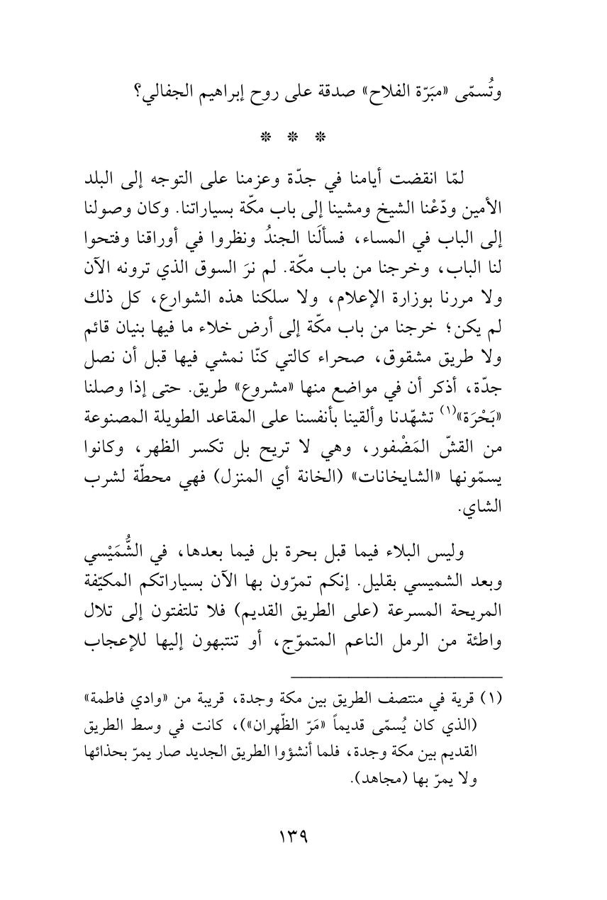 لمّا انقضت أيامنا في جدّة وعزمنا على التوجه إلى البلد الأمين ودّعْنا الشيخ ومشينا إلى باب مكّة بسياراتنا. وكان وصولنا إلى الباب في المساء، فسألَنا الجندُ ونظروا في أوراقنا وفتحوا لنا الباب، وخرجنا من باب مكّة. لم نرَ السوق الذي ترونه الآن ولا مررنا بوزارة الإعلام، ولا سلكنا هذه الشوارع، كل ذلك لم يكن؛ خرجنا من باب مكّة إلى أرض خلاء ما فيها بنيان قائم ولا طريق مشقوق، صحراء كالتي كنّا نمشي فيها قبل أن نصل جدّة، أذكر أن في مواضع منها «مشروع» طريق. حتى إذا وصلنا «بَحْرَة» (¬1) تشهّدنا وألقينا بأنفسنا على المقاعد الطويلة المصنوعة من القشّ المَضْفور، وهي لا تريح بل تكسر الظهر، وكانوا يسمّونها «الشايخانات» (الخانة أي المنزل) فهي محطّة لشرب الشاي.