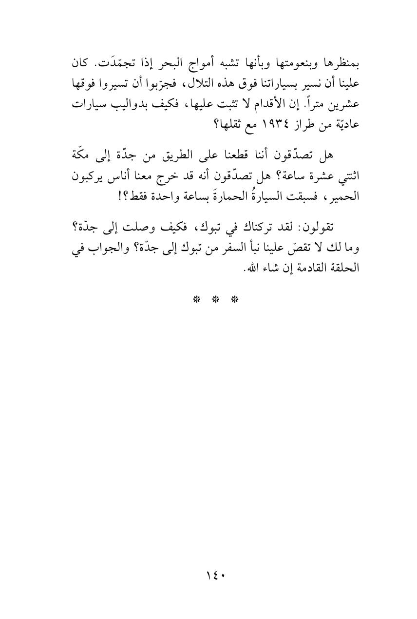 بمنظرها وبنعومتها وبأنها تشبه أمواج البحر إذا تجمّدَت. كان علينا أن نسير بسياراتنا فوق هذه التلال، فجرّبوا أن تسيروا فوقها عشرين متراً. إن الأقدام لاتثبت عليها، فكيف بدواليب سيارات عاديّة من طراز 1934 مع ثقلها؟