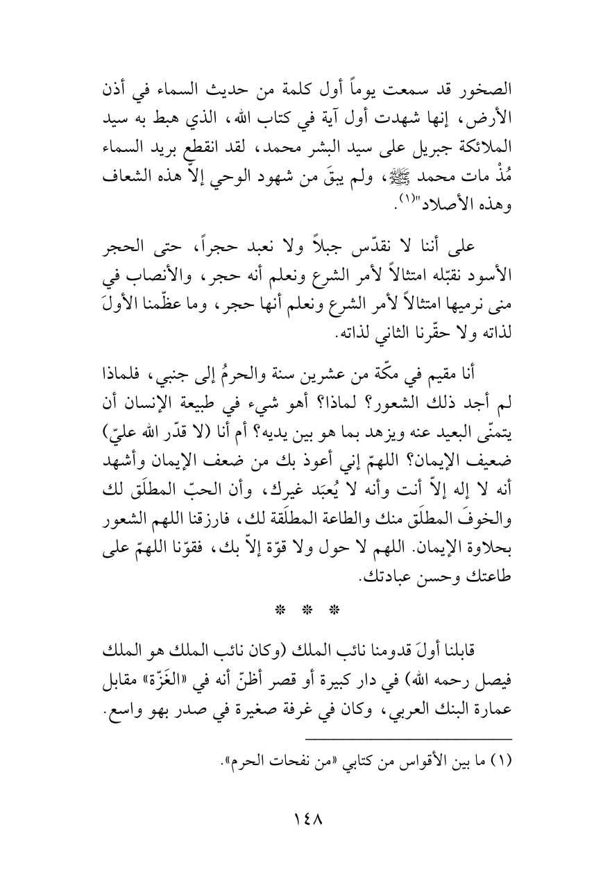 أنا مقيم في مكّة من عشرين سنة والحرمُ إلى جنبي، فلماذا لم أجد ذلك الشعور؟ لماذا؟ أهو شيء في طبيعة الإنسان أن يتمنّى البعيد عنه ويزهد بما هو بين يديه؟ أم أنا (لا قدّر الله عليّ) ضعيف الإيمان؟ اللهمّ إني أعوذ بك من ضعف الإيمان وأشهد أنه لا إله إلاّ أنت وأنه لا يُعبَد غيرك، وأن الحبّ المطلَق لك والخوفَ المطلَق منك والطاعة المطلَقة لك، فارزقنا اللهم الشعور بحلاوة الإيمان. اللهم لا حول ولا قوّة إلاّ بك، فقوّنا اللهمّ على طاعتك وحسن عبادتك.