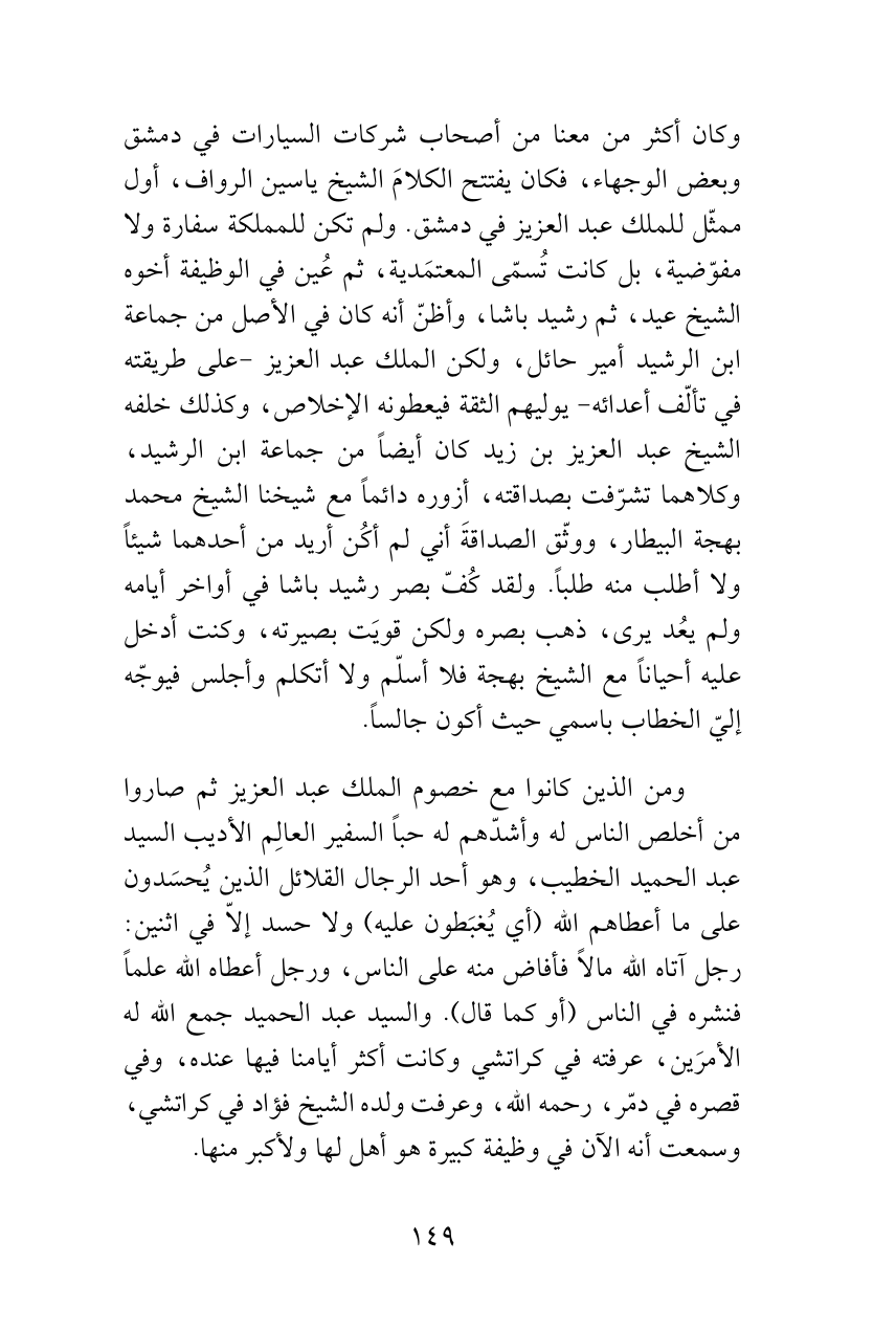 وكان أكثر من معنا من أصحاب شركات السيارات في دمشق وبعض الوجهاء، فكان يفتتح الكلامَ الشيخ ياسين الرواف، أول ممثّل للملك عبد العزيز في دمشق. ولم تكن للمملكة سفارة ولا مفوّضية، بل كانت تُسمّى المعتمَدية، ثم عُين في الوظيفة أخوه الشيخ عيد، ثم رشيد باشا، وأظنّ أنه كان في الأصل من جماعة ابن الرشيد أمير حائل، ولكن الملك عبدالعزيز -على طريقته في تألّف أعدائه- يوليهم الثقة فيعطونه الإخلاص، وكذلك خلفه الشيخ عبد العزيز بن زيد كان أيضاً من جماعة ابن الرشيد، وكلاهما تشرّفت بصداقته، أزوره دائماً مع شيخنا الشيخ محمد بهجة البيطار، ووثّق الصداقةَ أني لم أكُن أريد من أحدهما شيئاً ولا أطلب منه طلباً. ولقد كُفّ بصر رشيد باشا في أواخر أيامه ولم يعُد يرى، ذهب بصره ولكن قويَت بصيرته، وكنت أدخل عليه أحياناً مع الشيخ بهجة فلا أسلّم ولا أتكلم وأجلس فيوجّه إليّ الخطاب باسمي حيث أكون جالساً.