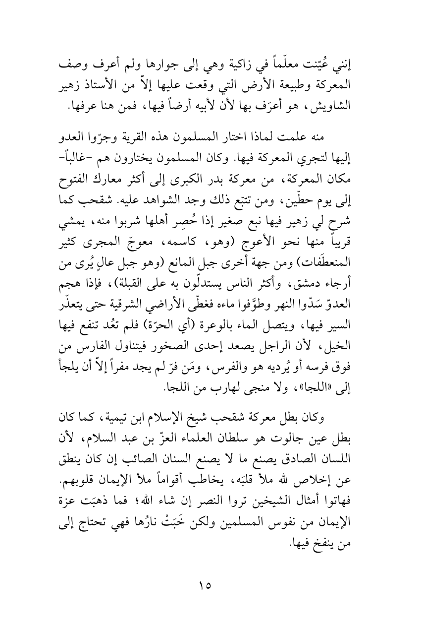 منه علمت لماذا اختار المسلمون هذه القرية وجرّوا العدو إليها لتجري المعركة فيها. وكان المسلمون يختارون هم -غالباً- مكان المعركة، من معركة بدر الكبرى إلى أكثر معارك الفتوح إلى يوم حطّين، ومن تتبّع ذلك وجد الشواهد عليه. شقحب كما شرح لي زهير فيها نبع صغير إذا حُصِر أهلها شربوا منه، يمشي قريباً منها نحو الأعوج (وهو، كاسمه، معوجّ المجرى كثير المنعطَفات) ومن جهة أخرى جبل المانع (وهو جبل عالٍ يُرى من أرجاء دمشق، وأكثر الناس يستدلّون به على القبلة)، فإذا هجم العدوّ سَدّوا النهر وطوَّفوا ماءه فغطّى الأراضي الشرقية حتى يتعذّر السير فيها، ويتصل الماء بالوعرة (أي الحرّة) فلم تعُد تنفع فيها الخيل، لأن الراجل يصعد إحدى الصخور فيتناول الفارس من فوق فرسه أو يُرديه هو والفرس، ومَن فرّ لم يجد مفراً إلاّ أن يلجأ إلى «اللجا»، ولا منجى لهارب من اللجا.