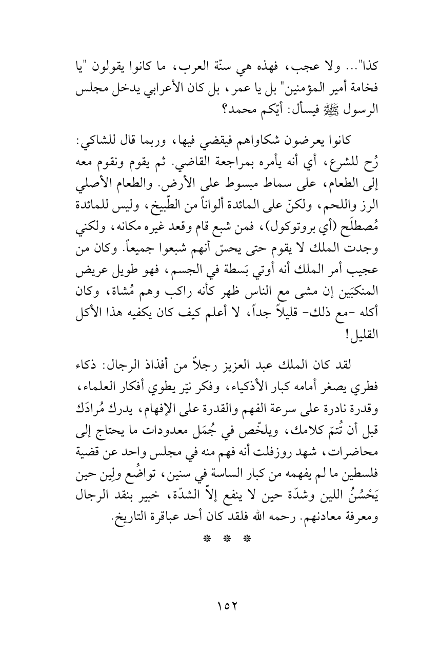 كانوا يعرضون شكاواهم فيقضي فيها، وربما قال للشاكي: رُح للشرع، أي أنه يأمره بمراجعة القاضي. ثم يقوم ونقوم معه إلى الطعام، على سماط مبسوط على الأرض. والطعام الأصلي الرز واللحم، ولكنّ على المائدة ألواناً من الطّبيخ، وليس للمائدة مُصطلَح (أي بروتوكول)، فمن شبع قام وقعد غيره مكانه، ولكني وجدت الملك لا يقوم حتى يحسّ أنهم شبعوا جميعاً. وكان من عجيب أمر الملك أنه أوتي بَسطة في الجسم، فهو طويل عريض المنكبَين إن مشى مع الناس ظهر كأنه راكب وهم مُشاة، وكان أكله -مع ذلك- قليلاً جداً، لا أعلم كيف كان يكفيه هذا الأكل القليل!