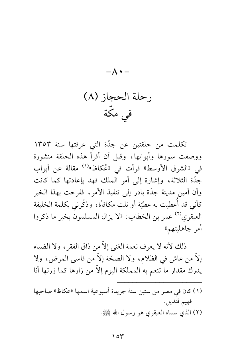 تكلمت من حلقتين عن جدّة التي عرفتها سنة 1353 ووصفت سورها وأبوابها، وقبل أن أقرأ هذه الحلقة منشورة في «الشرق الأوسط» قرأت في «عُكاظ» (¬1) مقالة عن أبواب جدّة الثلاثة، وإشارة إلى أمر الملك فهد بإعادتها كما كانت وأن أمين مدينة جدّة بادر إلى تنفيذ الأمر، ففرحت بهذا الخبر كأني قد أُعطيت به عطيّة أو نلت مكافأة، وذكّرني بكلمة الخليفة العبقري (¬2) عمر بن الخطاب: «لا يزال المسلمون بخير ما ذكروا أمر جاهليتهم».