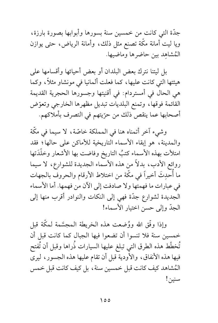 وشيء آخر أتمناه هنا في المملكة خاصّة، لا سيما في مكّة والمدينة، هو إبقاء الأسماء التاريخية للأماكن على حالها؛ فقد امتلأت بهذه الأسماء كتبُ التاريخ وفاضت بها الأشعار وخلّدَتها روائع الأدب، بدلاً من هذه الأسماء الجديدة للشوارع، لا سيما ما أُحدِثَ أخيراً في مكّة من اختلاط الأرقام والحروف بالجهات في عبارات ما فهمتها ولا صادفت إلى الآن من فهمها. أما الأسماء الجديدة لشوارع جدّة فهي إلى النكات والنوادر أقرب منها إلى الجدّ وإلى حسن اختيار الأسماء!