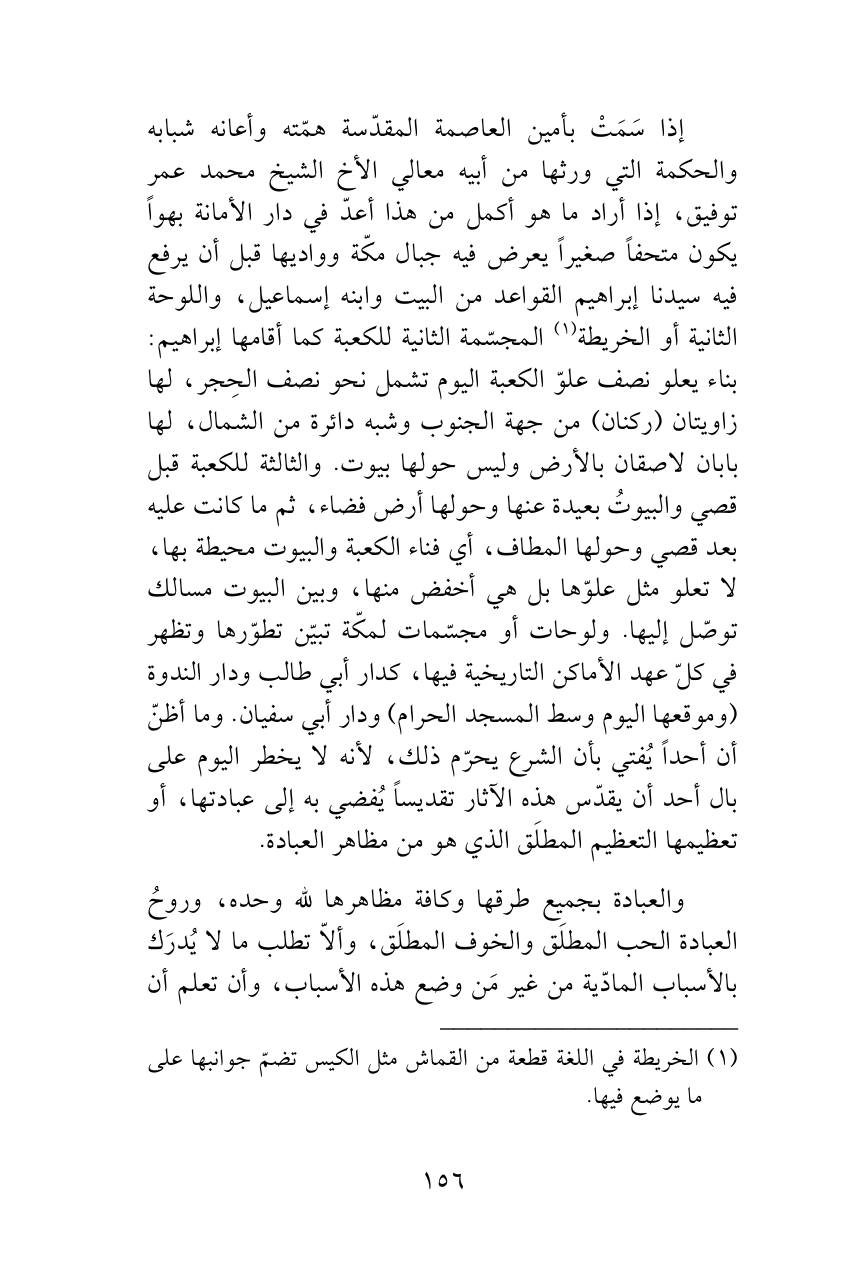إذا سَمَتْ بأمين العاصمة المقدّسة همّته وأعانه شبابه والحكمة التي ورثها من أبيه معالي الأخ الشيخ محمد عمر توفيق، إذا أراد ما هو أكمل من هذا أعدّ في دار الأمانة بهواً يكون متحفاً صغيراً يعرض فيه جبال مكّة وواديها قبل أن يرفع فيه سيدنا إبراهيم القواعد من البيت وابنه إسماعيل، واللوحة الثانية أو الخريطة (¬1) المجسّمة الثانية للكعبة كما أقامها إبراهيم: بناء يعلو نصف علوّ الكعبة اليوم تشمل نحو نصف الحِجر، لها زاويتان (ركنان) من جهة الجنوب وشبه دائرة من الشمال، لها بابان لاصقان بالأرض وليس حولها بيوت. والثالثة للكعبة قبل قصي والبيوتُ بعيدة عنها وحولها أرض فضاء، ثم ما كانت عليه بعد قصي وحولها المطاف، أي فناء الكعبة والبيوت محيطة بها، لا تعلو مثل علوّها بل هي أخفض منها، وبين البيوت مسالك توصّل إليها. ولوحات أو مجسّمات لمكّة تبيّن تطوّرها وتظهر في كلّ عهد الأماكن التاريخية فيها، كدار أبي طالب ودار الندوة (وموقعها اليوم وسط المسجد الحرام) ودار أبي سفيان. وما أظنّ أن أحداً يُفتي بأن الشرع يحرّم ذلك، لأنه لا يخطر اليوم على بال أحد أن يقدّس هذه الآثار تقديساً يُفضي به إلى عبادتها، أو تعظيمها التعظيم المطلَق الذي هو من مظاهر العبادة.