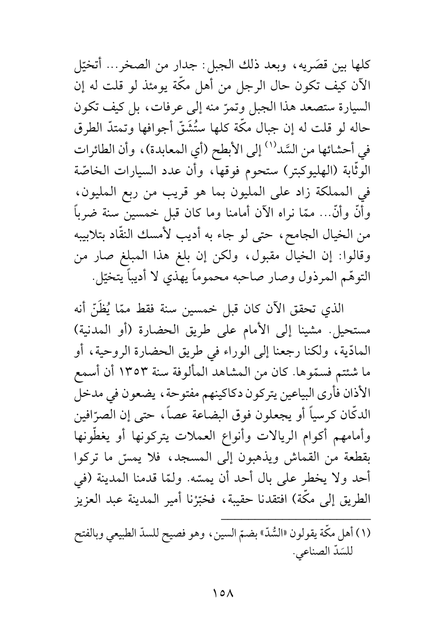 كلها بين قصَريه، وبعد ذلك الجبل: جدار من الصخر ... أتخيّل الآن كيف تكون حال الرجل من أهل مكّة يومئذ لو قلت له إن السيارة ستصعد هذا الجبل وتمرّ منه إلى عرفات، بل كيف تكون حاله لو قلت له إن جبال مكّة كلها ستُشَقّ أجوافها وتمتدّ الطرق في أحشائها من السَّد (¬1) إلى الأبطح (أي المعابدة)، وأن الطائرات الوثّابة (الهليوكبتر) ستحوم فوقها، وأن عدد السيارات الخاصّة في المملكة زاد على المليون بما هو قريب من ربع المليون، وأنّ وأنّ ... ممّا نراه الآن أمامنا وما كان قبل خمسين سنة ضرباً من الخيال الجامح، حتى لو جاء به أديب لأمسك النقّاد بتلابيبه وقالوا: إن الخيال مقبول، ولكن إن بلغ هذا المبلغ صار من التوهّم المرذول وصار صاحبه محموماً يهذي لا أديباً يتخيّل.