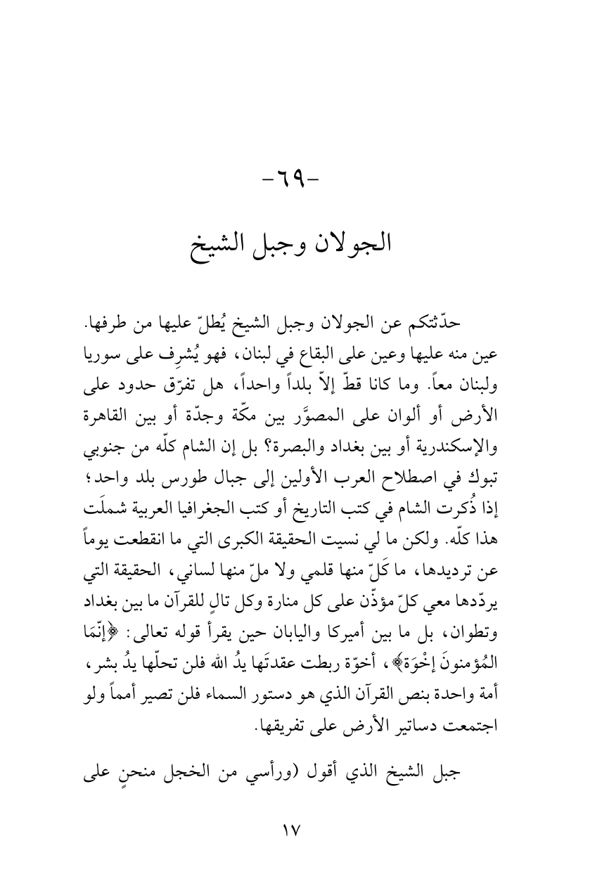حدّثتكم عن الجولان وجبل الشيخ يُطلّ عليها من طرفها. عين منه عليها وعين على البقاع في لبنان، فهو يُشرِف على سوريا ولبنان معاً. وما كانا قطّ إلاّ بلداً واحداً، هل تفرّق حدود على الأرض أو ألوان على المصوَّر بين مكّة وجدّة أو بين القاهرة والإسكندرية أو بين بغداد والبصرة؟ بل إن الشام كلّه من جنوبي تبوك في اصطلاح العرب الأولين إلى جبال طورس بلد واحد؛ إذا ذُكرت الشام في كتب التاريخ أو كتب الجغرافيا العربية شملَت هذا كلّه. ولكن ما لي نسيت الحقيقة الكبرى التي ما انقطعت يوماً عن ترديدها، ما كَلّ منها قلمي ولا ملّ منها لساني، الحقيقة التي يردّدها معي كلّ مؤذّن على كل منارة وكل تالٍ للقرآن ما بين بغداد وتطوان، بل ما بين أميركا واليابان حين يقرأ قوله تعالى: {إنّمَا المُؤمنونَ إخْوَة}، أخوّة ربطت عقدتَها يدُ الله فلن تحلّها يدُ بشر، أمة واحدة بنص القرآن الذي هو دستور السماء فلن تصير أمماً ولو اجتمعت دساتير الأرض على تفريقها.