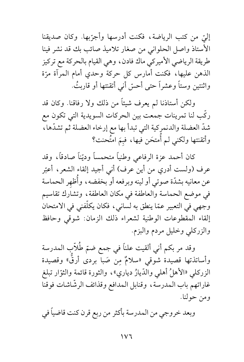 إليّ من كتب الرياضة، فكنت أدرسها وأجرّبها. وكان صديقنا الأستاذ واصل الحلواني من صغار تلاميذ صائب بك قد نشر فينا طريقة الرياضي الأميركي ماك فادن، وهي القيام بالحركة مع تركيز الذهن عليها، فكنت أمارس كل حركة وحدي أمام المرآة مرّة واثنتين وستاً وعشراً حتى أحسّ أني أتقنتها أو قاربتُ.