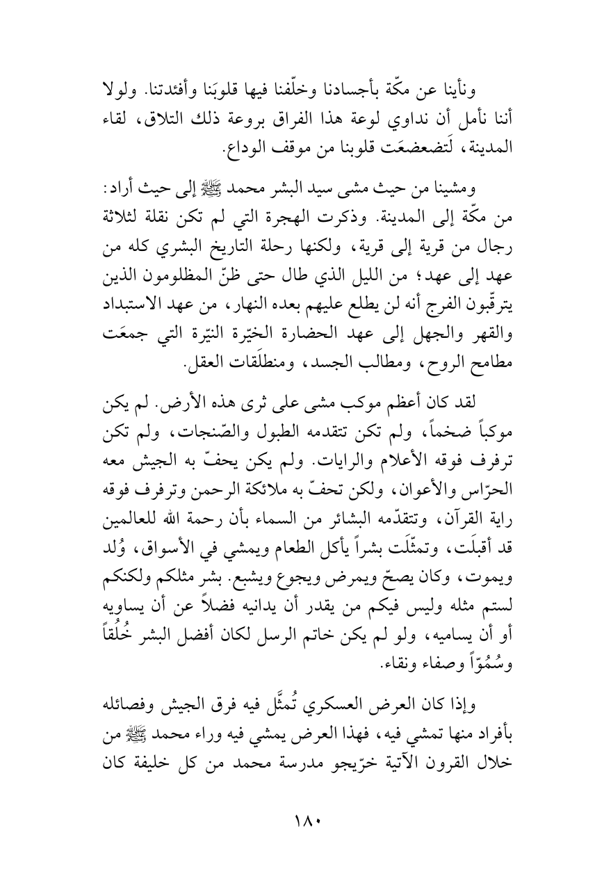 لقد كان أعظم موكب مشى على ثرى هذه الأرض. لم يكن موكباً ضخماً، ولم تكن تتقدمه الطبول والصّنجات، ولم تكن ترفرف فوقه الأعلام والرايات. ولم يكن يحفّ به الجيش معه الحرّاس والأعوان، ولكن تحفّ به ملائكة الرحمن وترفرف فوقه راية القرآن، وتتقدّمه البشائر من السماء بأن رحمة الله للعالمين قد أقبلَت، وتمثّلَت بشراً يأكل الطعام ويمشي في الأسواق، وُلد ويموت، وكان يصحّ ويمرض ويجوع ويشبع. بشر مثلكم ولكنكم لستم مثله وليس فيكم من يقدر أن يدانيه فضلاً عن أن يساويه أو أن يساميه، ولو لم يكن خاتم الرسل لكان أفضل البشر خُلُقاً وسُمُوّاً وصفاء ونقاء.