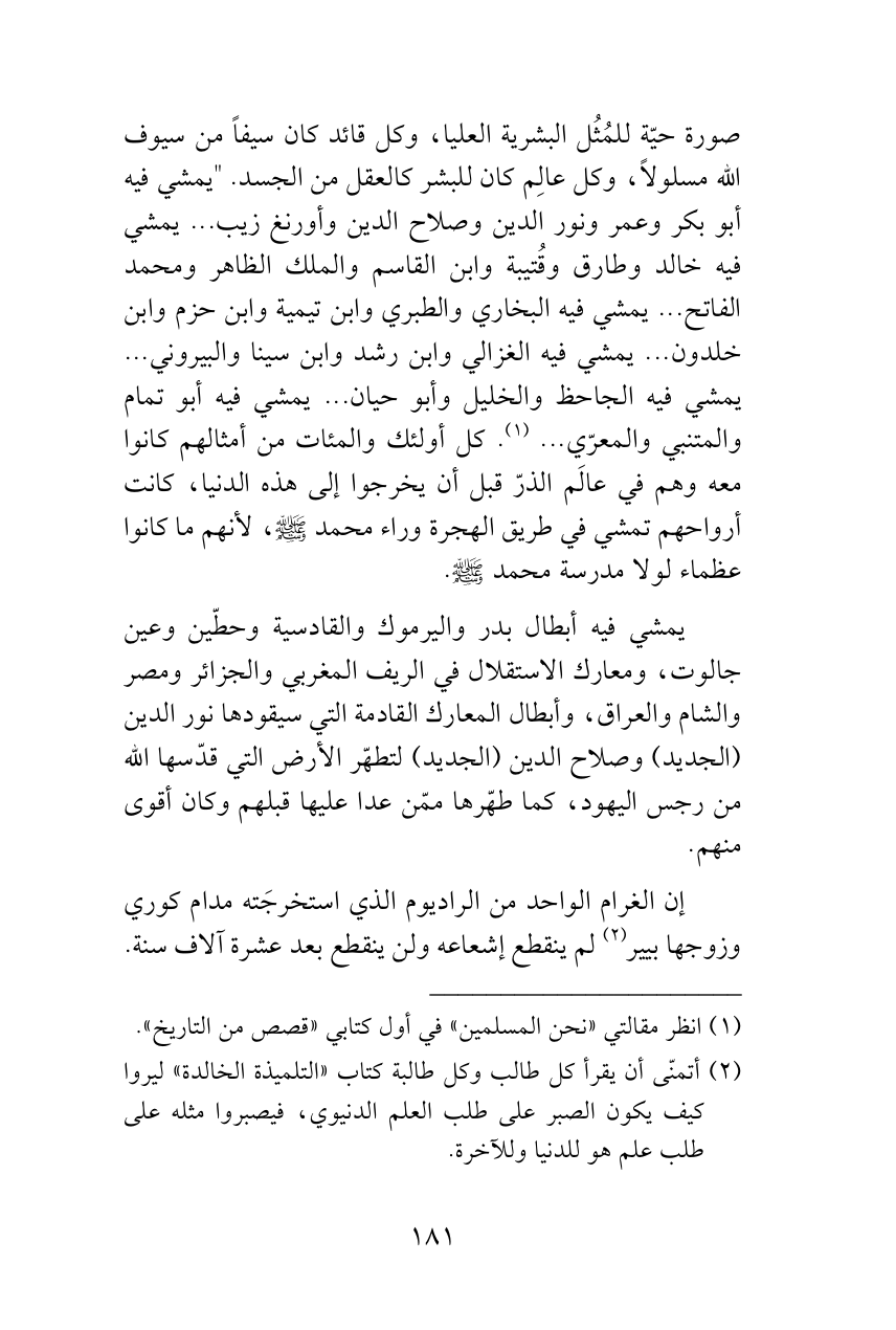 صورة حيّة للمُثُل البشرية العليا، وكل قائد كان سيفاً من سيوف الله مسلولاً، وكل عالِم كان للبشر كالعقل من الجسد. "يمشي فيه أبو بكر وعمر ونور الدين وصلاح الدين وأورنغ زيب ... يمشي فيه خالد وطارق وقُتيبة وابن القاسم والملك الظاهر ومحمد الفاتح ... يمشي فيه البخاري والطبري وابن تيمية وابن حزم وابن خلدون ... يمشي فيه الغزالي وابن رشد وابن سينا والبيروني ... يمشي فيه الجاحظ والخليل وأبو حيان ... يمشي فيه أبو تمام والمتنبي والمعرّي ... (¬1). كل أولئك والمئات من أمثالهم كانوا معه وهم في عالَم الذرّ قبل أن يخرجوا إلى هذه الدنيا، كانت أرواحهم تمشي في طريق الهجرة وراء محمد صلى الله عليه وسلم، لأنهم ما كانوا عظماء لولا مدرسة محمد صلى الله عليه وسلم.