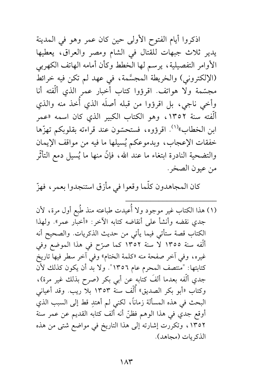 اذكروا أيام الفتوح الأولى حين كان عمر وهو في المدينة يدير ثلاث جبهات للقتال في الشام ومصر والعراق، يعطيها الأوامر التفصيلية، يرسم لها الخطط وكأن أمامه الهاتف الكهربي (الإلكتروني) والخريطة المجسَّمة، في عهد لم تكن فيه خرائط مجسّمة ولا هواتف. اقرؤوا كتاب أخبار عمر الذي ألّفته أنا وأخي ناجي، بل اقرؤوا من قبله أصلَه الذي أُخذ منه والذي ألّفته سنة 1352، وهو الكتاب الكبير الذي كان اسمه «عمر ابن الخطاب» (¬1). اقرؤوه، فستحسّون عند قراءته بقلوبكم تهزّها خفقات الإعجاب، وبدموعكم يُسيلها ما فيه من مواقف الإيمان والتضحية النادرة ابتغاء ما عند الله، فإنّ منها ما يُسيل دمع التأثّر من عيون الصخر.