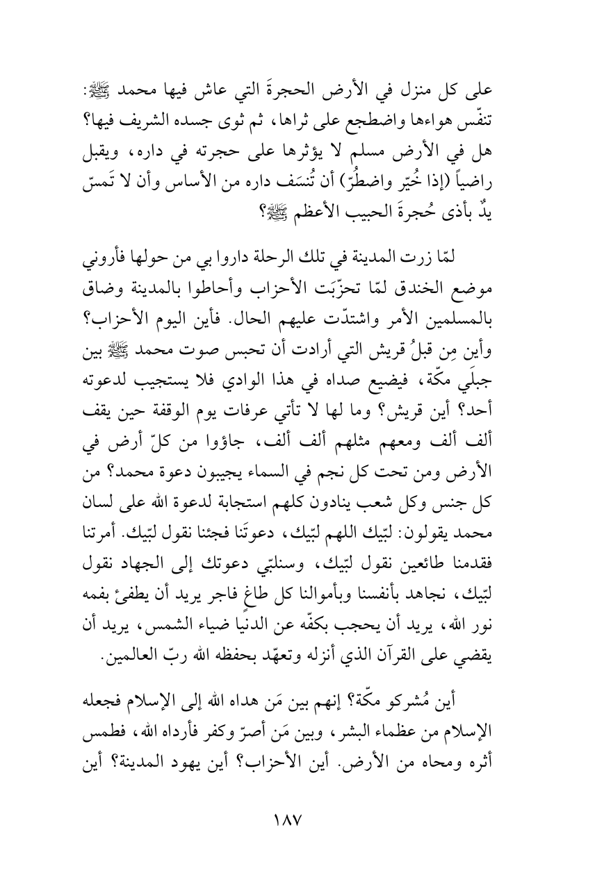 لمّا زرت المدينة في تلك الرحلة داروا بي من حولها فأروني موضع الخندق لمّا تحزّبَت الأحزاب وأحاطوا بالمدينة وضاق بالمسلمين الأمر واشتدّت عليهم الحال. فأين اليوم الأحزاب؟ وأين مِن قبلُ قريش التي أرادت أن تحبس صوت محمد صلى الله عليه وسلم بين جبلَي مكّة، فيضيع صداه في هذا الوادي فلا يستجيب لدعوته أحد؟ أين قريش؟ وما لها لا تأتي عرفات يوم الوقفة حين يقف ألف ألف ومعهم مثلهم ألف ألف، جاؤوا من كلّ أرض في الأرض ومن تحت كل نجم في السماء يجيبون دعوة محمد؟ من كل جنس وكل شعب ينادون كلهم استجابة لدعوة الله على لسان محمد يقولون: لبّيك اللهم لبّيك، دعوتَنا فجئنا نقول لبّيك. أمرتنا فقدمنا طائعين نقول لبّيك، وسنلبّي دعوتك إلى الجهاد نقول لبّيك، نجاهد بأنفسنا وبأموالنا كل طاغٍ فاجر يريد أن يطفئ بفمه نور الله، يريد أن يحجب بكفّه عن الدنيا ضياء الشمس، يريد أن يقضي على القرآن الذي أنزله وتعهّد بحفظه الله ربّ العالمين.