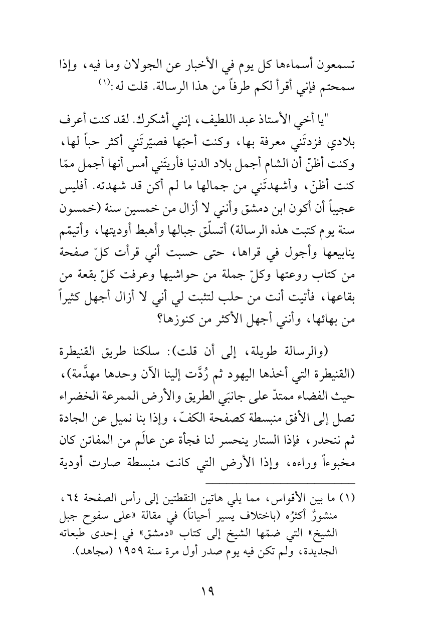 تسمعون أسماءها كل يوم في الأخبار عن الجولان وما فيه، وإذا سمحتم فإني أقرأ لكم طرفاً من هذا الرسالة. قلت له: (¬1)