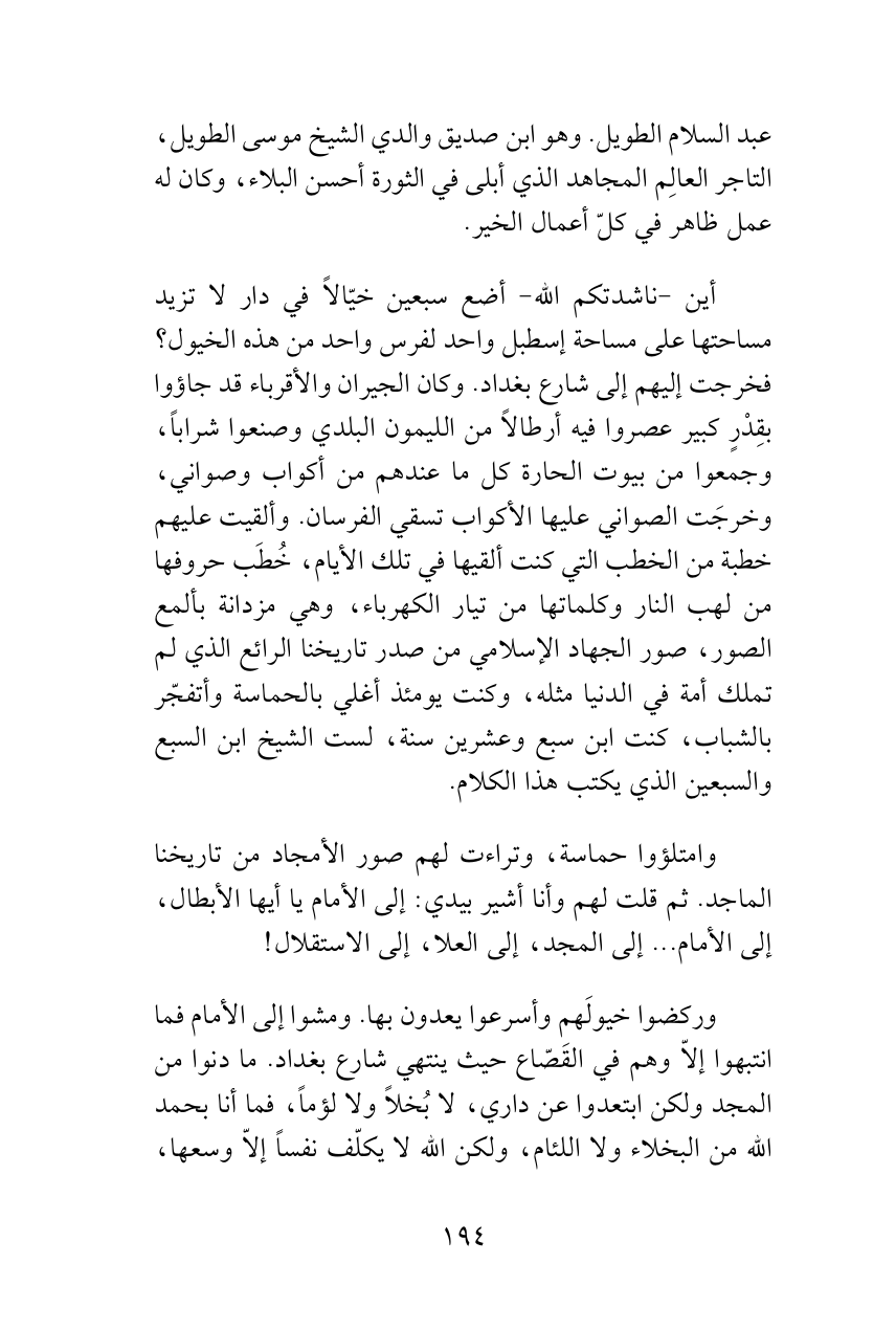 أين -ناشدتكم الله- أضع سبعين خيّالاً في دار لا تزيد مساحتها على مساحة إسطبل واحد لفرس واحد من هذه الخيول؟ فخرجت إليهم إلى شارع بغداد. وكان الجيران والأقرباء قد جاؤوا بقِدْرٍ كبير عصروا فيه أرطالاً من الليمون البلدي وصنعوا شراباً، وجمعوا من بيوت الحارة كل ما عندهم من أكواب وصواني، وخرجَت الصواني عليها الأكواب تسقي الفرسان. وألقيت عليهم خطبة من الخطب التي كنت ألقيها في تلك الأيام، خُطَب حروفها من لهب النار وكلماتها من تيار الكهرباء، وهي مزدانة بألمع الصور، صور الجهاد الإسلامي من صدر تاريخنا الرائع الذي لم تملك أمة في الدنيا مثله، وكنت يومئذ أغلي بالحماسة وأتفجّر بالشباب، كنت ابن سبع وعشرين سنة، لست الشيخ ابن السبع والسبعين الذي يكتب هذا الكلام.
