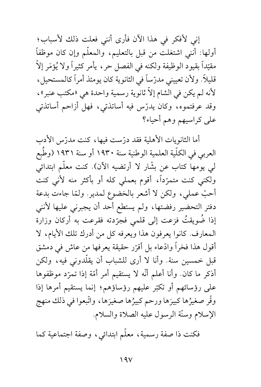 أما الثانويات الأهلية فقد درّست فيها، كنت مدرّس الأدب العربي في الكلّية العلمية الوطنية سنة 1930 أو سنة 1931 (وطُبع لي يومها كتاب عن بشّار لاأرتضيه الآن). كنت معلّم ابتدائي ولكني كنت متمرّداً، أقوم بعملي كله أو بأكثر منه لأني كنت أحبّ عملي، ولكن لا أشعر بالخضوع لمدير. ولمّا جاءت بدعة دفتر التحضير رفضتها، ولم يستطع أحد أن يجبرني عليها لأنني إذا ضُويقتُ فزعت إلى قلمي فجرّدته فقرعت به أركان وزارة المعارف. كانوا يعرفون هذا ويعرفه كل من أدرك تلك الأيام، لا أقول هذا فخراً وادّعاء بل أقرّر حقيقة يعرفها من عاش في دمشق قبل خمسين سنة. وأنا لا أرى للشباب أن يقلّدوني فيه، ولكن أذكر ما كان. وأنا أعلم أنّه لا يستقيم أمر أمّة إذا تمرّد موظفوها على رؤسائهم أو تكبّر عليهم رؤساؤهم؛ إنما يستقيم أمرها إذا وقّر صغيرُها كبيرَها ورحم كبيرُها صغيرَها، واتّبعوا في ذلك منهج الإسلام وسنّة الرسول عليه الصلاة والسلام.