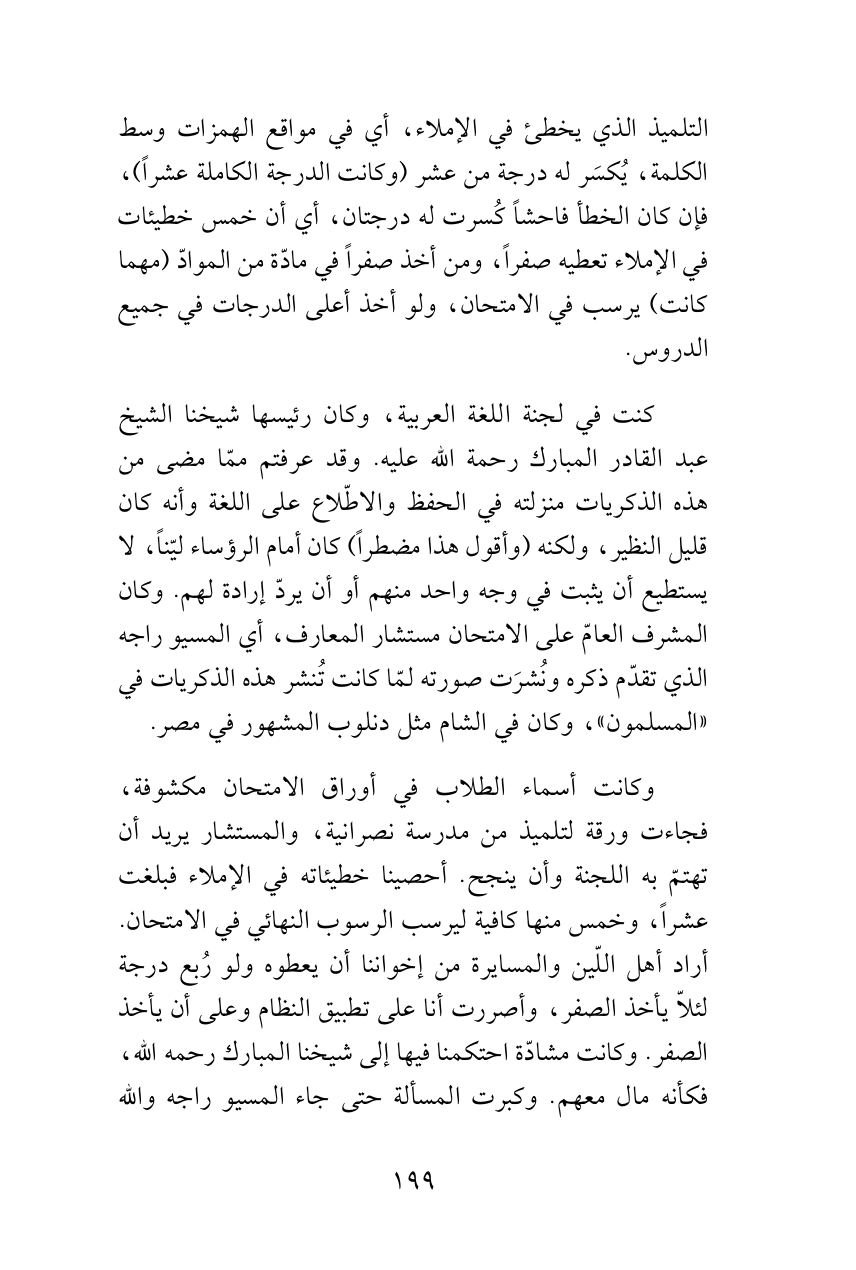 وكانت أسماء الطلاب في أوراق الامتحان مكشوفة، فجاءت ورقة لتلميذ من مدرسة نصرانية، والمستشار يريد أن تهتمّ به اللجنة وأن ينجح. أحصينا خطيئاته في الإملاء فبلغت عشراً، وخمس منها كافية ليرسب الرسوب النهائي في الامتحان. أراد أهل اللّين والمسايرة من إخواننا أن يعطوه ولو رُبع درجة لئلاّ يأخذ الصفر، وأصررت أنا على تطبيق النظام وعلى أن يأخذ الصفر. وكانت مشادّة احتكمنا فيها إلى شيخنا المبارك رحمه الله، فكأنه مال معهم. وكبرت المسألة حتى جاء المسيو راجه والله
