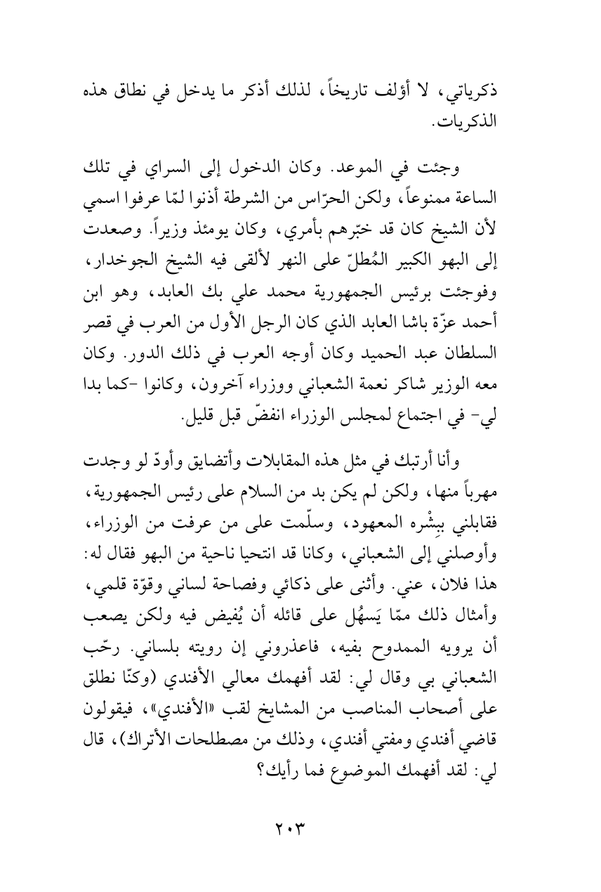 وأنا أرتبك في مثل هذه المقابلات وأتضايق وأودّ لو وجدت مهرباً منها، ولكن لم يكن بد من السلام على رئيس الجمهورية، فقابلني ببِشْره المعهود، وسلّمت على من عرفت من الوزراء، وأوصلني إلى الشعباني، وكانا قد انتحيا ناحية من البهو فقال له: هذا فلان، عني. وأثنى على ذكائي وفصاحة لساني وقوّة قلمي، وأمثال ذلك ممّا يَسهُل على قائله أن يُفيض فيه ولكن يصعب أن يرويه الممدوح بفيه، فاعذروني إن رويته بلساني. رحّب الشعباني بي وقال لي: لقد أفهمك معالي الأفندي (وكنّا نطلق على أصحاب المناصب من المشايخ لقب «الأفندي»، فيقولون قاضي أفندي ومفتي أفندي، وذلك من مصطلحات الأتراك)، قال لي: لقد أفهمك الموضوع فما رأيك؟