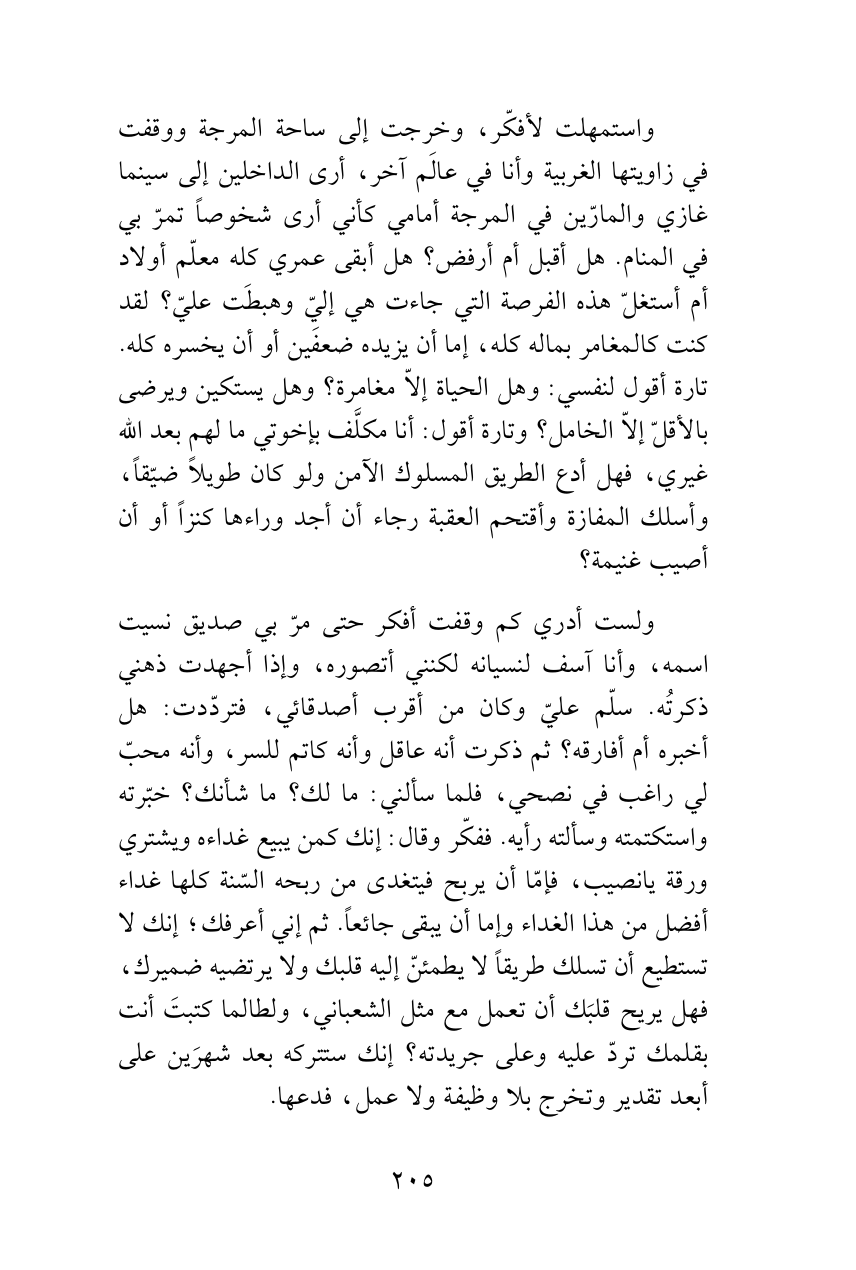 واستمهلت لأفكّر، وخرجت إلى ساحة المرجة ووقفت في زاويتها الغربية وأنا في عالَم آخر، أرى الداخلين إلى سينما غازي والمارّين في المرجة أمامي كأني أرى شخوصاً تمرّ بي في المنام. هل أقبل أم أرفض؟ هل أبقى عمري كله معلّم أولاد أم أستغلّ هذه الفرصة التي جاءت هي إليّ وهبطَت عليّ؟ لقد كنت كالمغامر بماله كله، إما أن يزيده ضعفَين أو أن يخسره كله. تارة أقول لنفسي: وهل الحياة إلاّ مغامرة؟ وهل يستكين ويرضى بالأقلّ إلاّ الخامل؟ وتارة أقول: أنا مكلَّف بإخوتي ما لهم بعد الله غيري، فهل أدع الطريق المسلوك الآمن ولو كان طويلاً ضيّقاً، وأسلك المفازة وأقتحم العقبة رجاء أن أجد وراءها كنزاً أو أن أصيب غنيمة؟