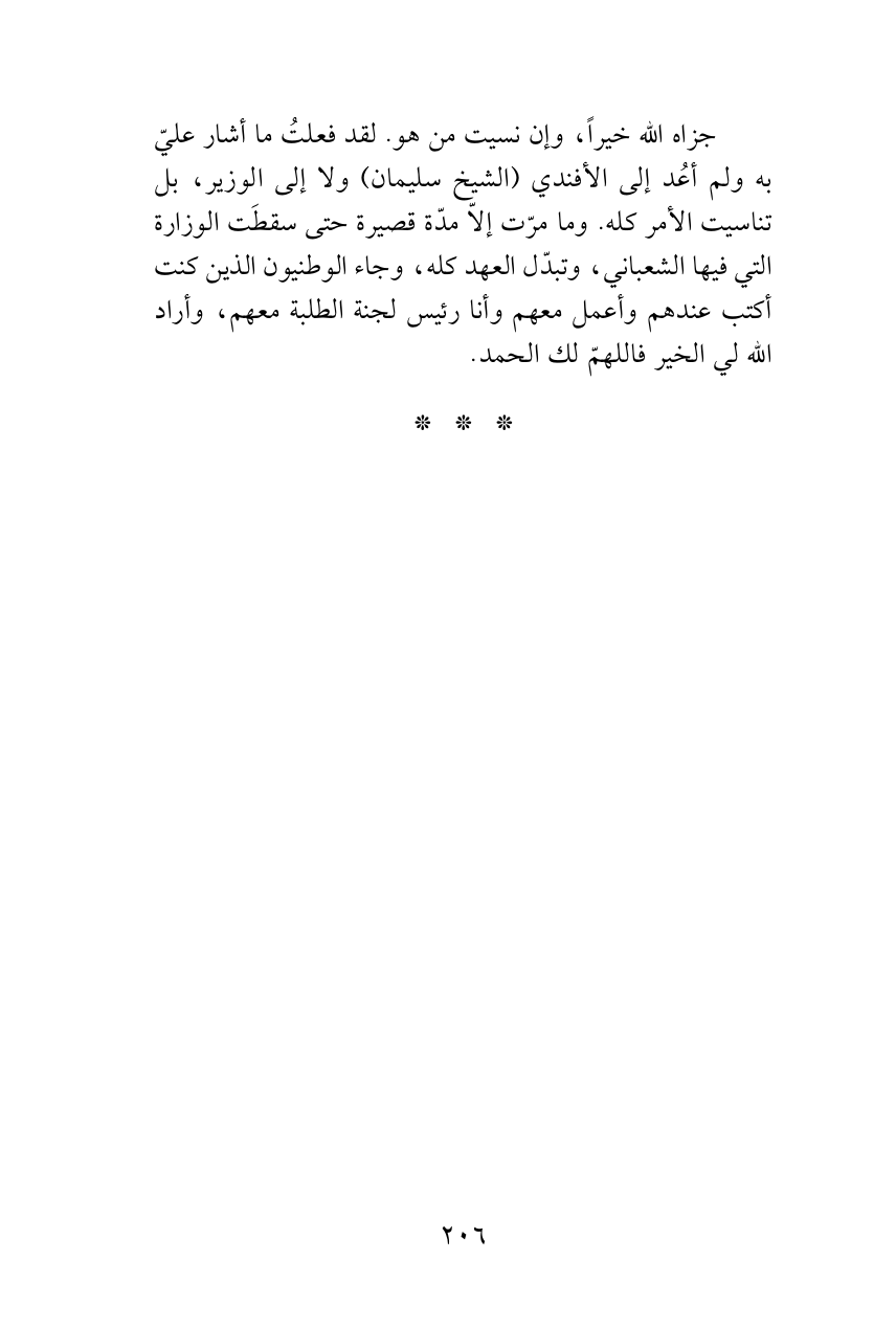 جزاه الله خيراً، وإن نسيت من هو. لقد فعلتُ ما أشار عليّ به ولم أعُد إلى الأفندي (الشيخ سليمان) ولا إلى الوزير، بل تناسيت الأمر كله. وما مرّت إلاّ مدّة قصيرة حتى سقطَت الوزارة التي فيها الشعباني، وتبدّل العهد كله، وجاء الوطنيون الذين كنت أكتب عندهم وأعمل معهم وأنا رئيس لجنة الطلبة معهم، وأراد الله لي الخير فاللهمّ لك الحمد.