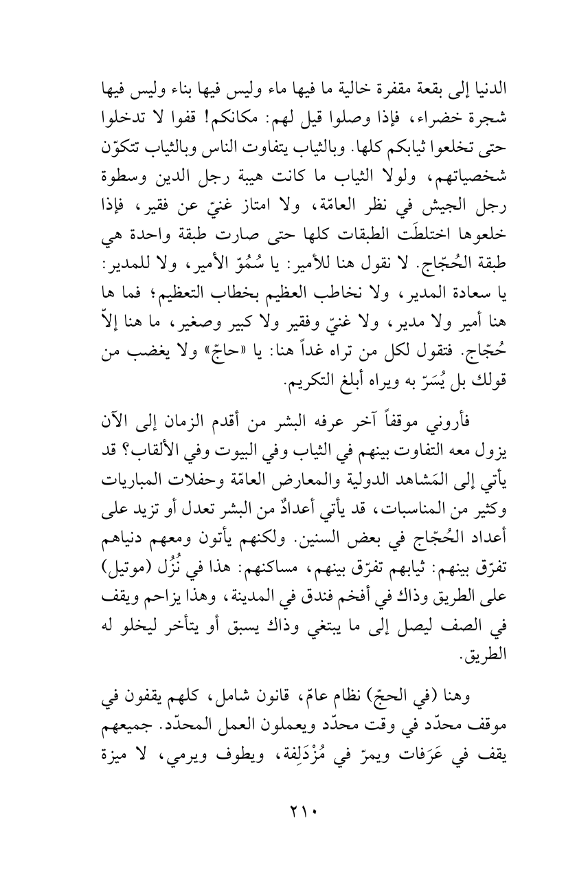 الدنيا إلى بقعة مقفرة خالية ما فيها ماء وليس فيها بناء وليس فيها شجرة خضراء، فإذا وصلوا قيل لهم: مكانكم! قفوا لا تدخلوا حتى تخلعوا ثيابكم كلها. وبالثياب يتفاوت الناس وبالثياب تتكوّن شخصياتهم، ولولا الثياب ما كانت هيبة رجل الدين وسطوة رجل الجيش في نظر العامّة، ولا امتاز غنيّ عن فقير، فإذا خلعوها اختلطَت الطبقات كلها حتى صارت طبقة واحدة هي طبقة الحُجّاج. لا نقول هنا للأمير: يا سُمُوّ الأمير، ولا للمدير: يا سعادة المدير، ولا نخاطب العظيم بخطاب التعظيم؛ فما ها هنا أمير ولا مدير، ولا غنيّ وفقير ولا كبير وصغير، ما هنا إلاّ حُجّاج. فتقول لكل من تراه غداً هنا: يا «حاجّ» ولا يغضب من قولك بل يُسَرّ به ويراه أبلغ التكريم.