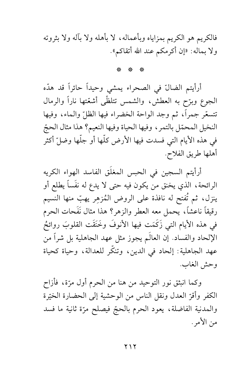 أرأيتم الضالّ في الصحراء يمشي وحيداً حائراً قد هدّه الجوع وبرّح به العطش، والشمس تتلظّى أشعّتها ناراً والرمال تتسعّر جمراً، ثم وجد الواحة الخضراء فيها الظلّ والماء، وفيها النخيل المحمّل بالتمر، وفيها الحياة وفيها النعيم؟ هذا مثال الحجّ في هذه الأيام التي فسدت فيها الأرض كلّها أو جلّها وضلّ أكثر أهلها طريق الفلاح.