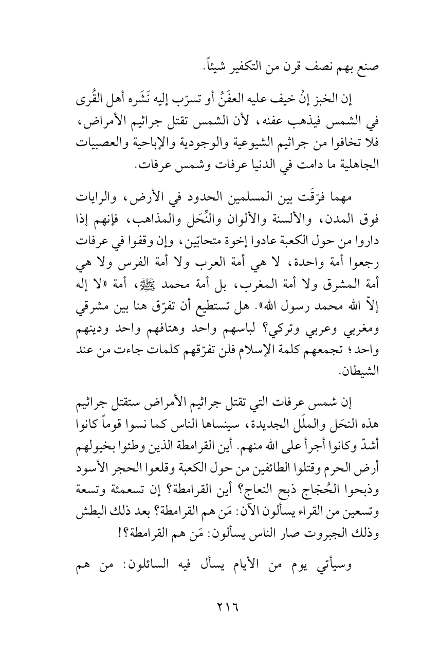 إن شمس عرفات التي تقتل جراثيم الأمراض ستقتل جراثيم هذه النحَل والملَل الجديدة، سينساها الناس كما نسوا قوماً كانوا أشدّ وكانوا أجرأ على الله منهم. أين القرامطة الذين وطئوا بخيولهم أرض الحرم وقتلوا الطائفين من حول الكعبة وقلعوا الحجر الأسود وذبحوا الحُجّاج ذبح النعاج؟ أين القرامطة؟ إن تسعمئة وتسعة وتسعين من القراء يسألون الآن: مَن هم القرامطة؟ بعد ذلك البطش وذلك الجبروت صار الناس يسألون: مَن هم القرامطة؟!