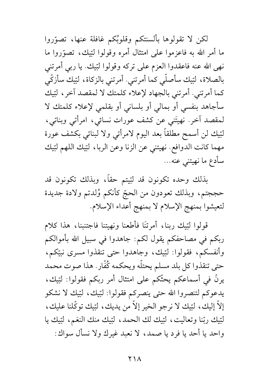 لكن لا تقولوها بألسنتكم وقلوبُكم غافلة عنها، تصوّروا ما أمر الله به فاعزموا على امتثال أمره وقولوا لبّيك، تصوّروا ما نهى الله عنه فاعقدوا العزم على تركه وقولوا لبّيك. يا ربي أمرتني بالصلاة، لبّيك سأصلّي كما أمرتني. أمرتني بالزكاة، لبّيك سأزكّي كما أمرتني. أمرتني بالجهاد لإعلاء كلمتك لا لمقصد آخر، لبّيك سأجاهد بنفسي أو بمالي أو بلساني أو بقلمي لإعلاء كلمتك لا لمقصد آخر. نهيتَني عن كشف عورات نسائي، امرأتي وبناتي، لبّيك لن أسمح مطلقاً بعد اليوم لامرأتي ولا لبناتي بكشف عورة مهما كانت الدوافع. نهيتني عن الزنا وعن الربا، لبّيك اللهم لبّيك سأدع ما نهيتني عنه ...