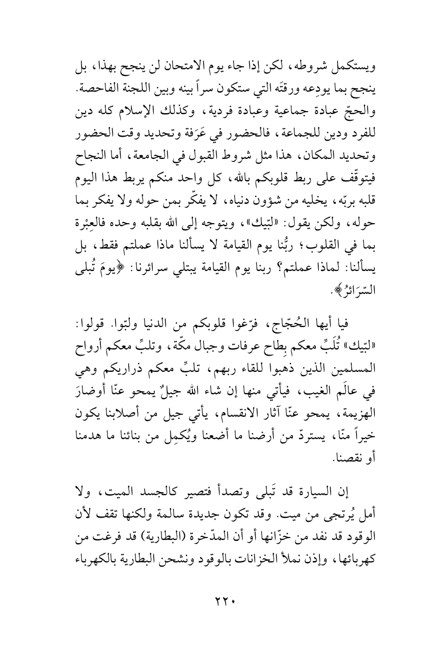 ويستكمل شروطه، لكن إذا جاء يوم الامتحان لن ينجح بهذا، بل ينجح بما يودِعه ورقتَه التي ستكون سراً بينه وبين اللجنة الفاحصة. والحجّ عبادة جماعية وعبادة فردية، وكذلك الإسلام كله دين للفرد ودين للجماعة، فالحضور في عَرَفة وتحديد وقت الحضور وتحديد المكان، هذا مثل شروط القبول في الجامعة، أما النجاح فيتوقّف على ربط قلوبكم بالله، كل واحد منكم يربط هذا اليوم قلبه بربّه، يخليه من شؤون دنياه، لا يفكّر بمن حوله ولا يفكر بما حوله، ولكن يقول: «لبّيك»، ويتوجه إلى الله بقلبه وحده فالعِبْرة بما في القلوب؛ ربُّنا يوم القيامة لا يسألنا ماذا عملتم فقط، بل يسألنا: لماذا عملتم؟ ربنا يوم القيامة يبتلي سرائرنا: {يومَ تُبلى السّرَائرُ}.