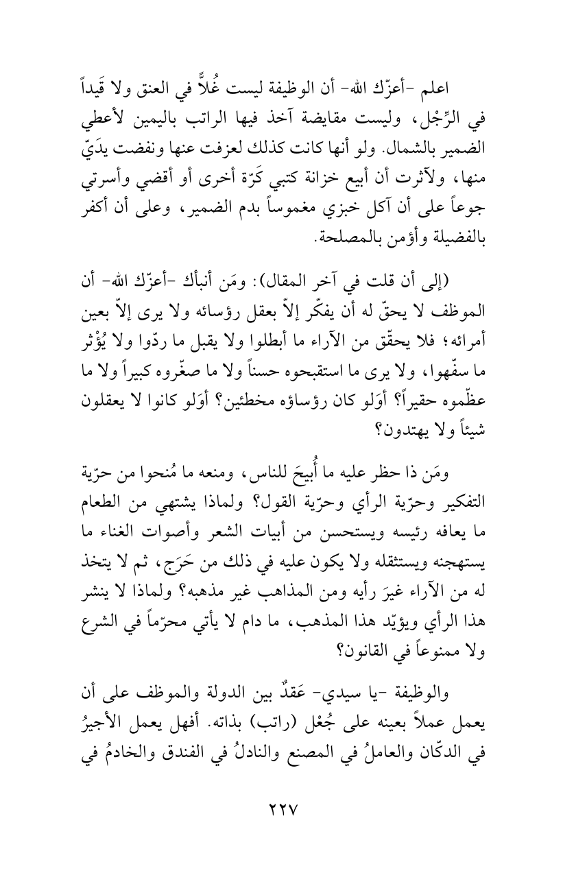 اعلم -أعزّك الله- أن الوظيفة ليست غُلاًّ في العنق ولا قَيداً في الرِّجْل، وليست مقايضة آخذ فيها الراتب باليمين لأعطي الضمير بالشمال. ولو أنها كانت كذلك لعزفت عنها ونفضت يدَيّ منها، ولآثرت أن أبيع خزانة كتبي كَرّة أخرى أو أقضي وأسرتي جوعاً على أن آكل خبزي مغموساً بدم الضمير، وعلى أن أكفر بالفضيلة وأؤمن بالمصلحة.