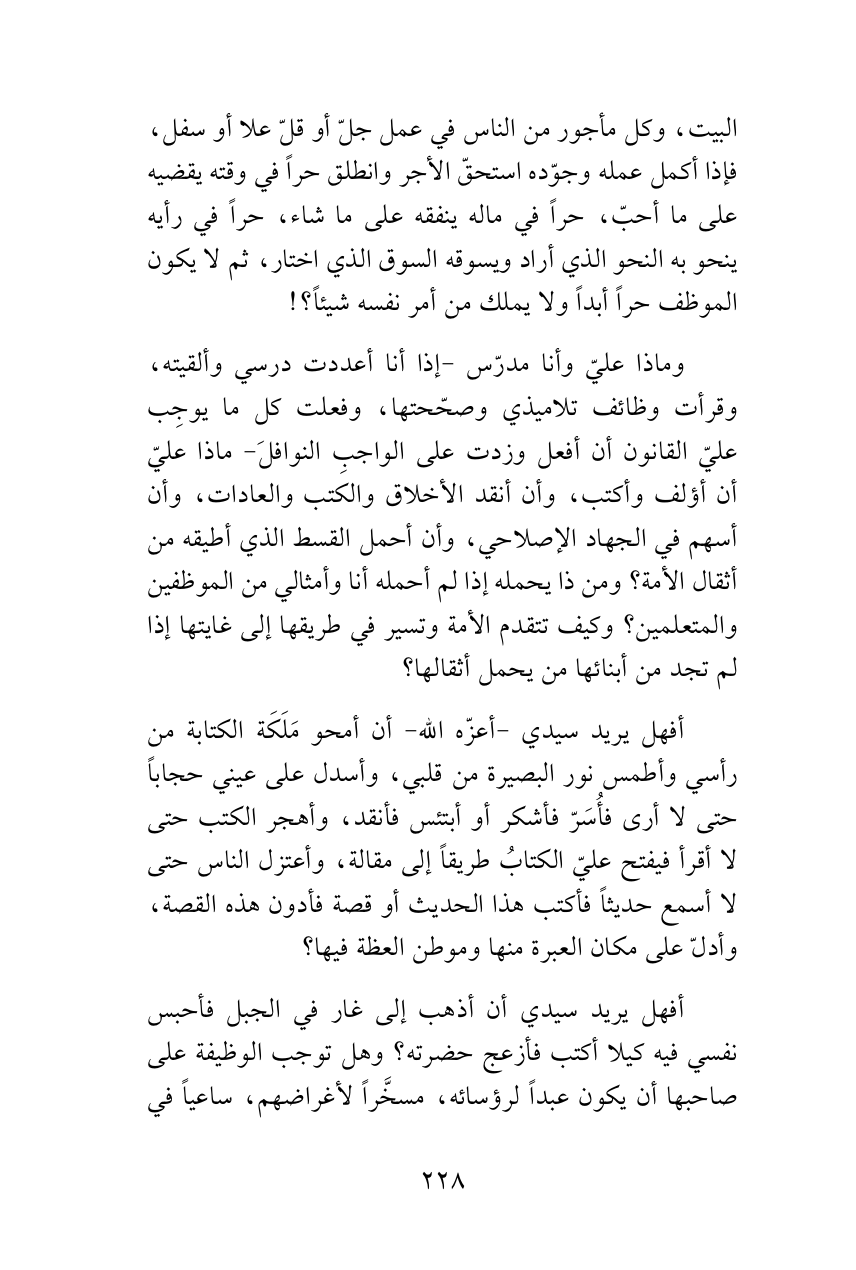 البيت، وكل مأجور من الناس في عمل جلّ أو قلّ علا أو سفل، فإذا أكمل عمله وجوّده استحقّ الأجر وانطلق حراً في وقته يقضيه على ما أحبّ، حراً في ماله ينفقه على ما شاء، حراً في رأيه ينحو به النحو الذي أراد ويسوقه السوق الذي اختار، ثم لا يكون الموظف حراً أبداً ولا يملك من أمر نفسه شيئاً؟!