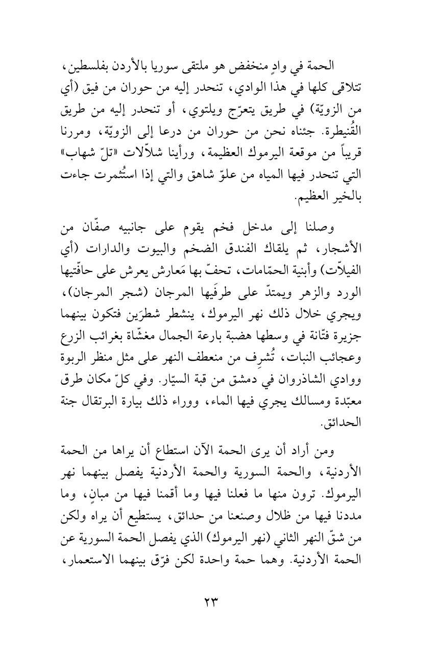 وصلنا إلى مدخل فخم يقوم على جانبيه صفّان من الأشجار، ثم يلقاك الفندق الضخم والبيوت والدارات (أي الفيلاّت) وأبنية الحمّامات، تحفّ بها مَعارش يعرش على حافّتيها الورد والزهر ويمتدّ على طرفَيها المرجان (شجر المرجان)، ويجري خلال ذلك نهر اليرموك، ينشطر شطرَين فتكون بينهما جزيرة فتّانة في وسطها هضبة بارعة الجمال مغشّاة بغرائب الزرع وعجائب النبات، تُشرِف من منعطف النهر على مثل منظر الربوة ووادي الشاذروان في دمشق من قبة السيّار. وفي كلّ مكان طرق معبّدة ومسالك يجري فيها الماء، ووراء ذلك بيارة البرتقال جنة الحدائق.