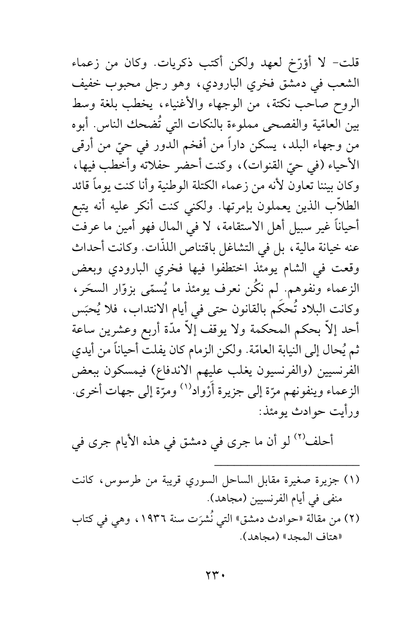 قلت- لا أؤرّخ لعهد ولكن أكتب ذكريات. وكان من زعماء الشعب في دمشق فخري البارودي، وهو رجل محبوب خفيف الروح صاحب نكتة، من الوجهاء والأغنياء، يخطب بلغة وسط بين العامّية والفصحى مملوءة بالنكات التي تُضحك الناس. أبوه من وجهاء البلد، يسكن داراً من أفخم الدور في حيّ من أرقى الأحياء (في حيّ القنوات)، وكنت أحضر حفلاته وأخطب فيها، وكان بيننا تعاون لأنه من زعماء الكتلة الوطنية وأنا كنت يوماً قائد الطلاّب الذين يعملون بإمرتها. ولكني كنت أنكر عليه أنه يتبع أحياناً غير سبيل أهل الاستقامة، لا في المال فهو أمين ما عرفت عنه خيانة مالية، بل في التشاغل باقتناص اللذّات. وكانت أحداث وقعت في الشام يومئذ اختطفوا فيها فخري البارودي وبعض الزعماء ونفوهم. لم نكُن نعرف يومئذ ما يُسمّى بزوّار السحَر، وكانت البلاد تُحكَم بالقانون حتى في أيام الانتداب، فلا يُحبَس أحد إلاّ بحكم المحكمة ولا يوقف إلاّ مدّة أربع وعشرين ساعة ثم يُحال إلى النيابة العامّة. ولكن الزمام كان يفلت أحياناً من أيدي الفرنسيين (والفرنسيون يغلب عليهم الاندفاع) فيمسكون ببعض الزعماء وينفونهم مرّة إلى جزيرة أَرْواد (¬1) ومرّة إلى جهات أخرى. ورأيت حوادث يومئذ:
