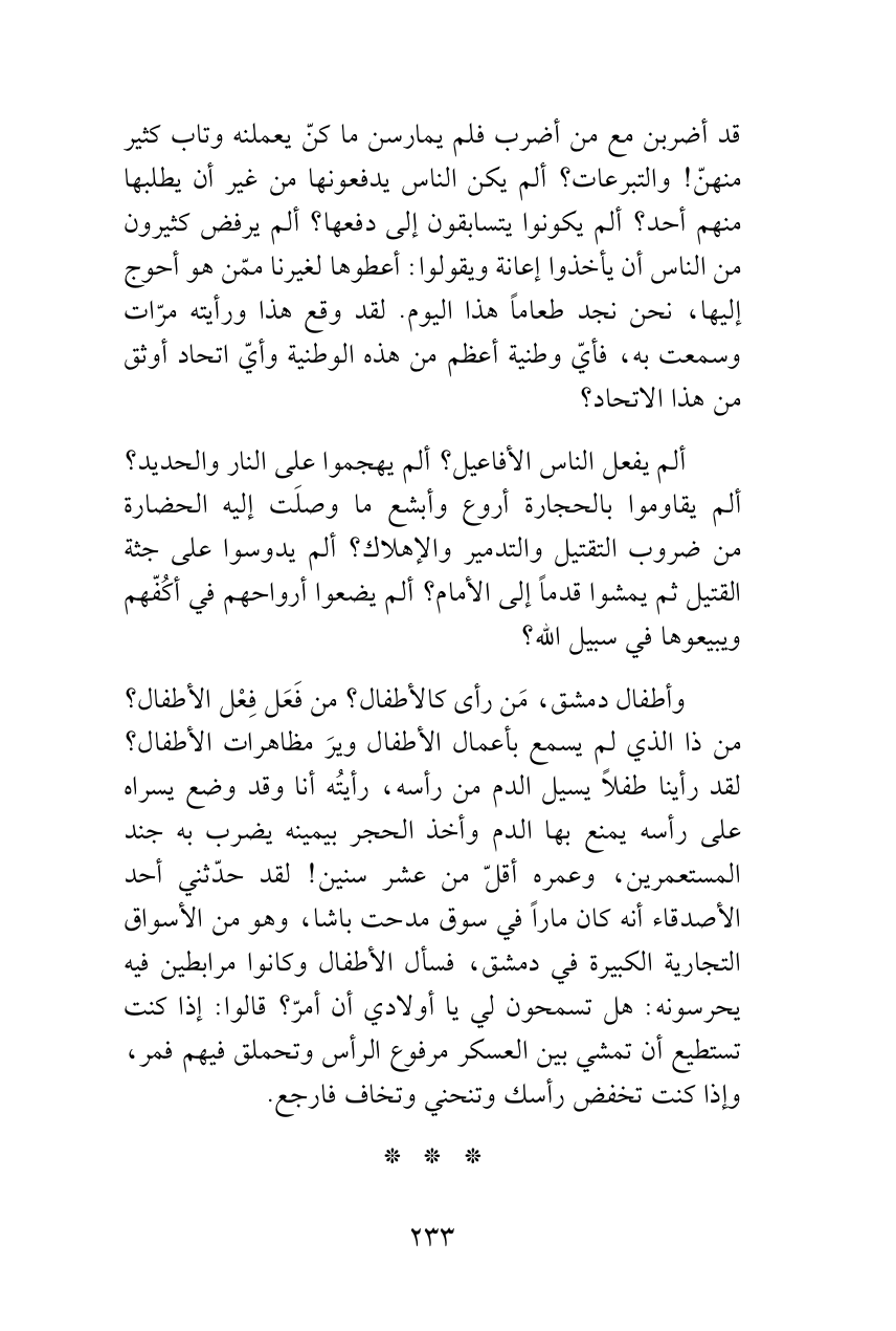 وأطفال دمشق، مَن رأى كالأطفال؟ من فَعَل فِعْل الأطفال؟ من ذا الذي لم يسمع بأعمال الأطفال ويرَ مظاهرات الأطفال؟ لقد رأينا طفلاً يسيل الدم من رأسه، رأيتُه أنا وقد وضع يسراه على رأسه يمنع بها الدم وأخذ الحجر بيمينه يضرب به جند المستعمرين، وعمره أقلّ من عشر سنين! لقد حدّثني أحد الأصدقاء أنه كان ماراً في سوق مدحت باشا، وهو من الأسواق التجارية الكبيرة في دمشق، فسأل الأطفال وكانوا مرابطين فيه يحرسونه: هل تسمحون لي يا أولادي أن أمرّ؟ قالوا: إذا كنت تستطيع أن تمشي بين العسكر مرفوع الرأس وتحملق فيهم فمر، وإذا كنت تخفض رأسك وتنحني وتخاف فارجع.