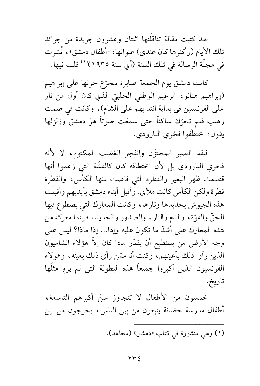 لقد كتبت مقالة تناقلَتها اثنتان وعشرون جريدة من جرائد تلك الأيام (وأكثرها كان عندي) عنوانها: «أطفال دمشق»، نُشرت في مجلّة الرسالة في تلك السنة (أي سنة 1935) (¬1) قلت فيها: