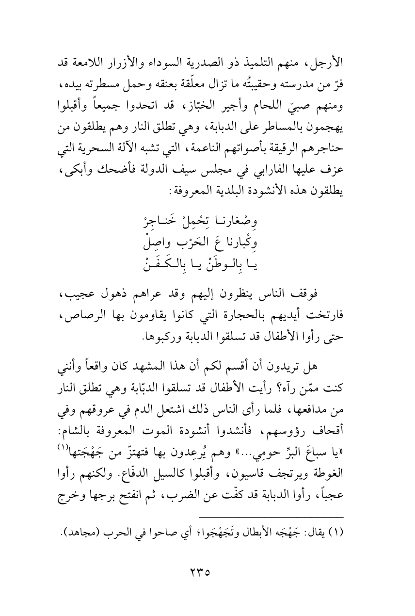 الأرجل، منهم التلميذ ذو الصدرية السوداء والأزرار اللامعة قد فرّ من مدرسته وحقيبتُه ما تزال معلّقة بعنقه وحمل مسطرته بيده، ومنهم صبيّ اللحام وأجير الخبّاز، قد اتحدوا جميعاً وأقبلوا يهجمون بالمساطر على الدبابة، وهي تطلق النار وهم يطلقون من حناجرهم الرقيقة بأصواتهم الناعمة، التي تشبه الآلة السحرية التي عزف عليها الفارابي في مجلس سيف الدولة فأضحك وأبكى، يطلقون هذه الأنشودة البلدية المعروفة: