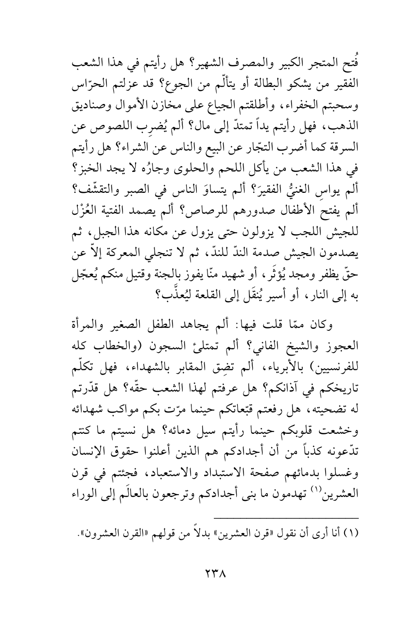 وكان ممّا قلت فيها: ألم يجاهد الطفل الصغير والمرأة العجوز والشيخ الفاني؟ ألم تمتلئ السجون (والخطاب كله للفرنسيين) بالأبرياء، ألم تضِق المقابر بالشهداء، فهل تكلّم تاريخكم في آذانكم؟ هل عرفتم لهذا الشعب حقّه؟ هل قدّرتم له تضحيته، هل رفعتم قبّعاتكم حينما مرّت بكم مواكب شهدائه وخشعت قلوبكم حينما رأيتم سيل دمائه؟ هل نسيتم ما كنتم تدّعونه كذباً من أن أجدادكم هم الذين أعلنوا حقوق الإنسان وغسلوا بدمائهم صفحة الاستبداد والاستعباد، فجئتم في قرن العشرين (¬1) تهدمون ما بنى أجدادكم وترجعون بالعالَم إلى الوراء