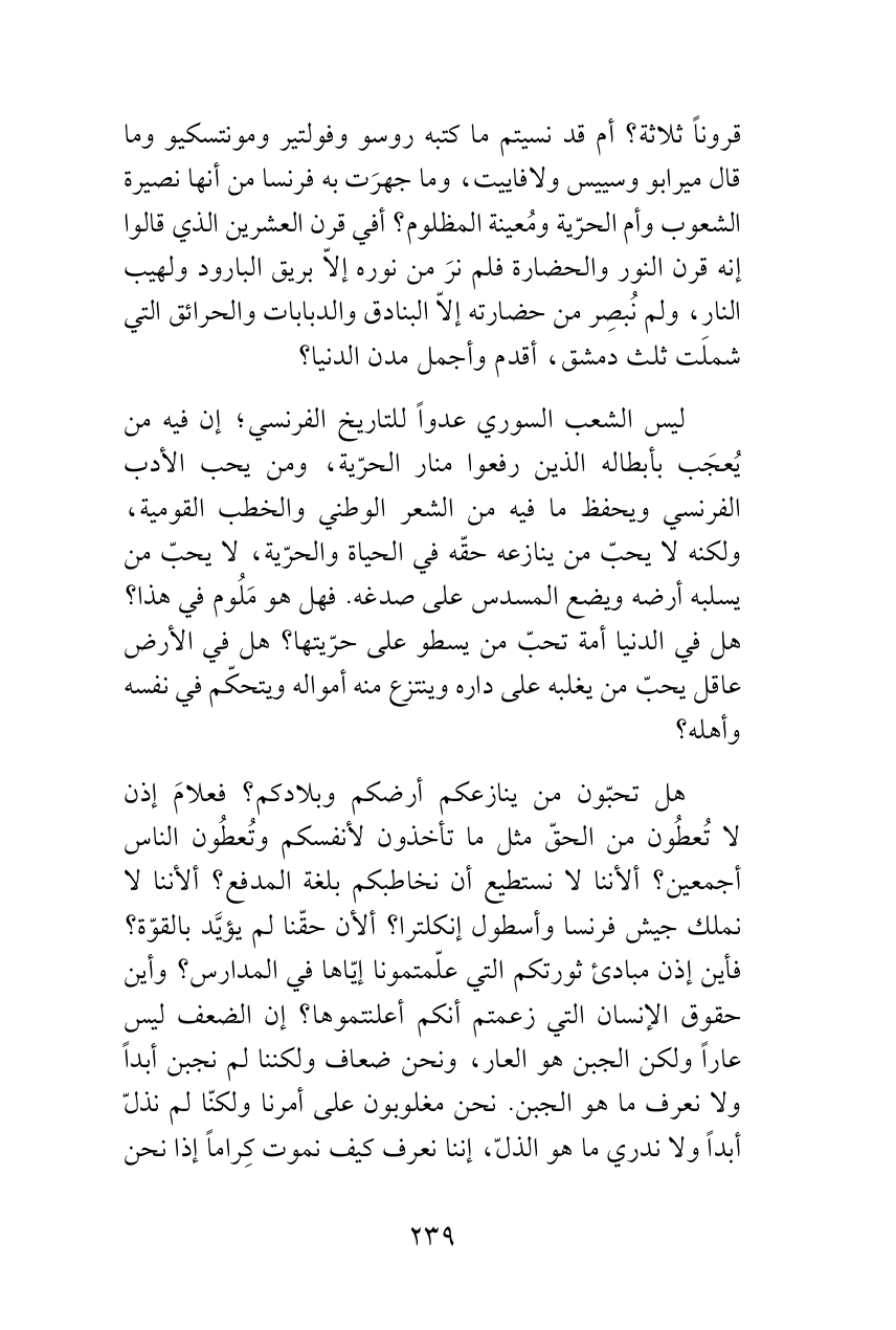 قروناً ثلاثة؟ أم قد نسيتم ما كتبه روسو وفولتير ومونتسكيو وما قال ميرابو وسييس ولافاييت، وما جهرَت به فرنسا من أنها نصيرة الشعوب وأم الحرّية ومُعينة المظلوم؟ أفي قرن العشرين الذي قالوا إنه قرن النور والحضارة فلم نرَ من نوره إلاّ بريق البارود ولهيب النار، ولم نُبصِر من حضارته إلاّ البنادق والدبابات والحرائق التي شملَت ثلث دمشق، أقدم وأجمل مدن الدنيا؟