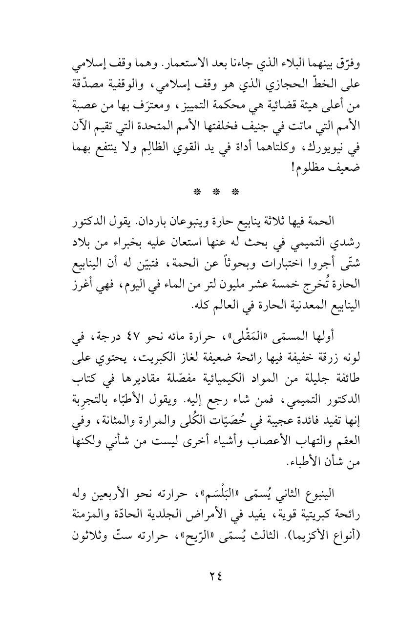 أولها المسمّى «المَقْلى»، حرارة مائه نحو 47 درجة، في لونه زرقة خفيفة فيها رائحة ضعيفة لغاز الكبريت، يحتوي على طائفة جليلة من المواد الكيميائية مفصّلة مقاديرها في كتاب الدكتور التميمي، فمن شاء رجع إليه. ويقول الأطبّاء بالتجرِبة إنها تفيد فائدة عجيبة في حُصَيّات الكُلى والمرارة والمثانة، وفي العقم والتهاب الأعصاب وأشياء أخرى ليست من شأني ولكنها من شأن الأطباء.