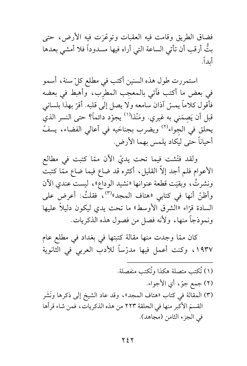 (¬3) المقالة في كتاب «هتاف المجد»، وقد عاد الشيخ إلى ذكرها ونَشَر القسمَ الأكبر منها في الحلقة 223 من هذه الذكريات، فمن شاء قرأها في الجزء الثامن (مجاهد).