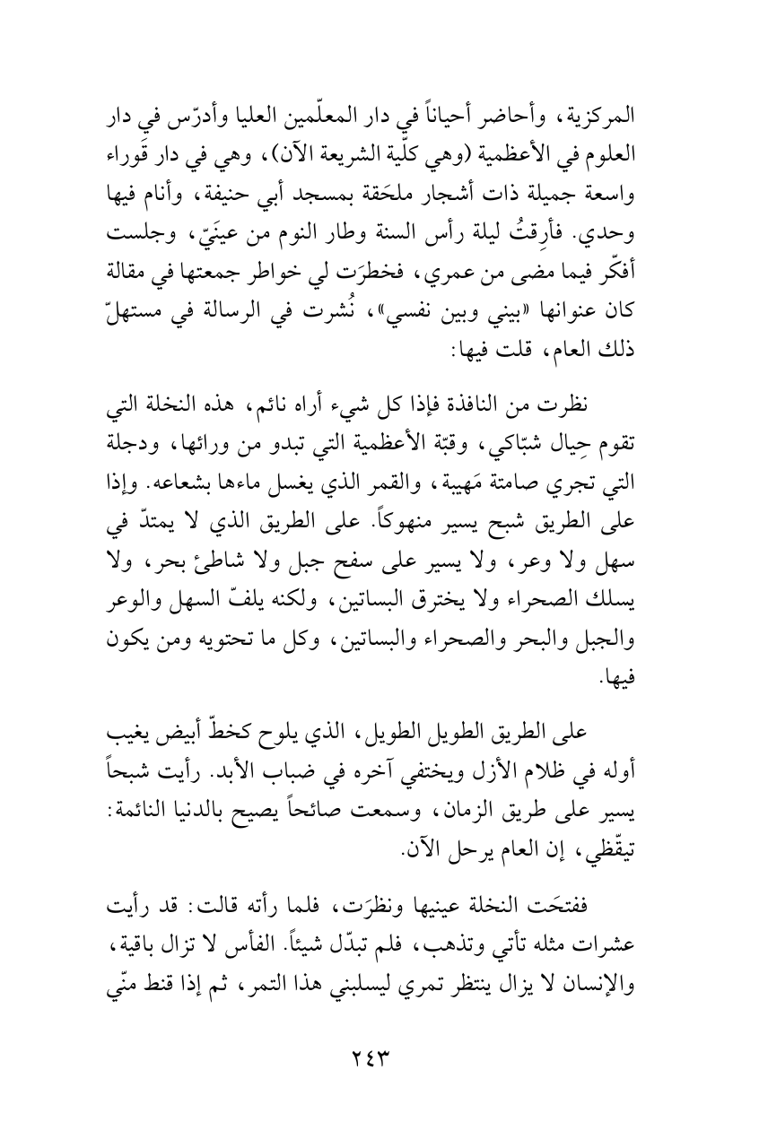 المركزية، وأحاضر أحياناً في دار المعلّمين العليا وأدرّس في دار العلوم في الأعظمية (وهي كلّية الشريعة الآن)، وهي في دار قَوراء واسعة جميلة ذات أشجار ملحَقة بمسجد أبي حنيفة، وأنام فيها وحدي. فأرِقتُ ليلة رأس السنة وطار النوم من عينَيّ، وجلست أفكّر فيما مضى من عمري، فخطرَت لي خواطر جمعتها في مقالة كان عنوانها «بيني وبين نفسي»، نُشرت في الرسالة في مستهلّ ذلك العام، قلت فيها: