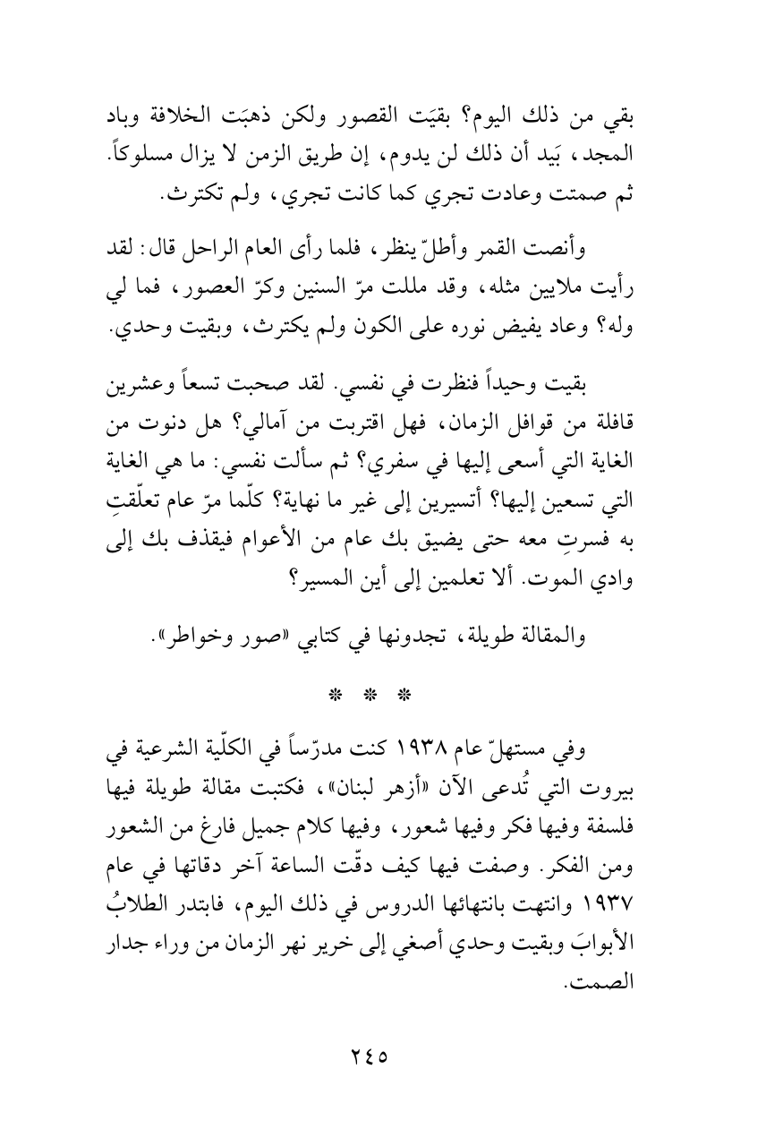 وفي مستهلّ عام 1938 كنت مدرّساً في الكلّية الشرعية في بيروت التي تُدعى الآن «أزهر لبنان»، فكتبت مقالة طويلة فيها فلسفة وفيها فكر وفيها شعور، وفيها كلام جميل فارغ من الشعور ومن الفكر. وصفت فيها كيف دقّت الساعة آخر دقاتها في عام 1937 وانتهت بانتهائها الدروس في ذلك اليوم، فابتدر الطلابُ الأبوابَ وبقيت وحدي أصغي إلى خرير نهر الزمان من وراء جدار الصمت.