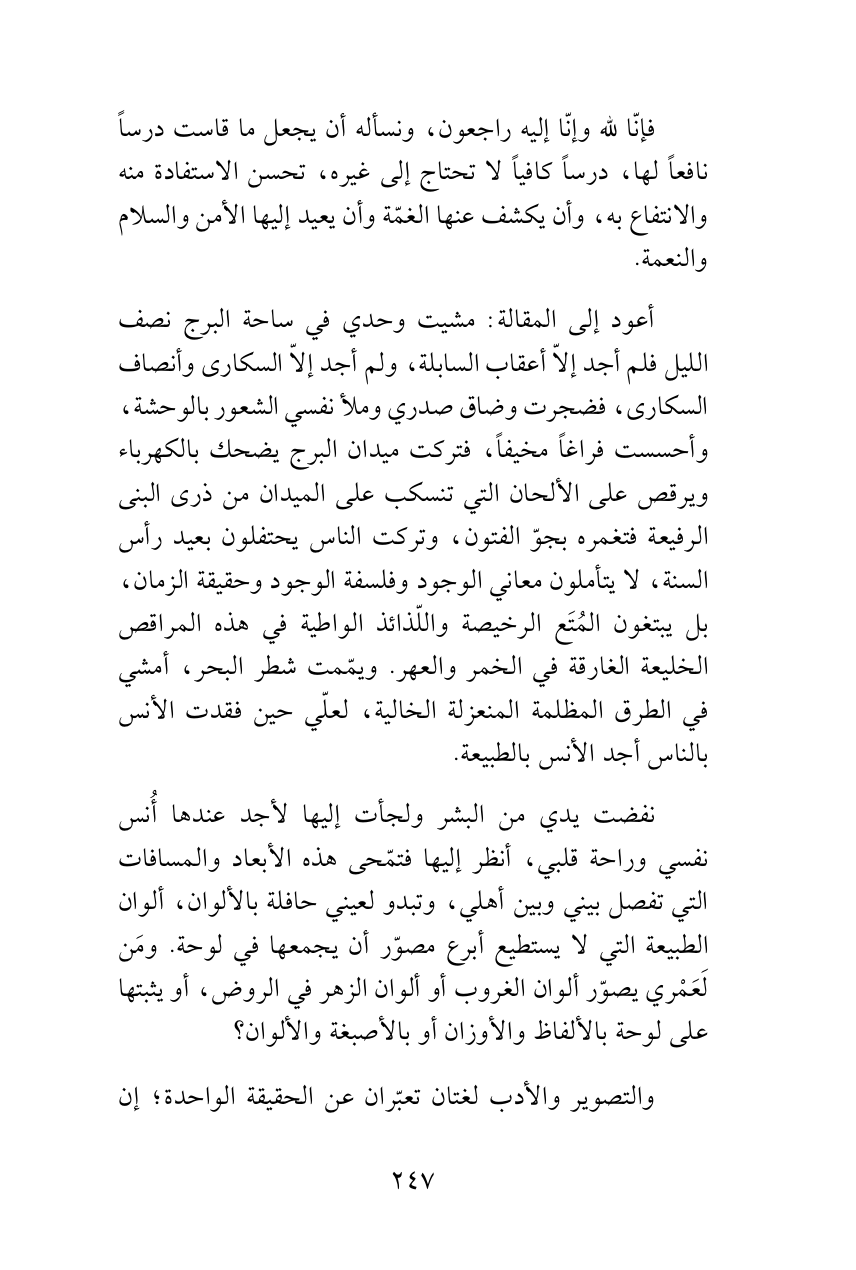 أعود إلى المقالة: مشيت وحدي في ساحة البرج نصف الليل فلم أجد إلاّ أعقاب السابلة، ولم أجد إلاّ السكارى وأنصاف السكارى، فضجرت وضاق صدري وملأ نفسي الشعور بالوحشة، وأحسست فراغاً مخيفاً، فتركت ميدان البرج يضحك بالكهرباء ويرقص على الألحان التي تنسكب على الميدان من ذرى البنى الرفيعة فتغمره بجوّ الفتون، وتركت الناس يحتفلون بعيد رأس السنة، لا يتأملون معاني الوجود وفلسفة الوجود وحقيقة الزمان، بل يبتغون المُتَع الرخيصة واللّذائذ الواطية في هذه المراقص الخليعة الغارقة في الخمر والعهر. ويمّمت شطر البحر، أمشي في الطرق المظلمة المنعزلة الخالية، لعلّي حين فقدت الأنس بالناس أجد الأنس بالطبيعة.