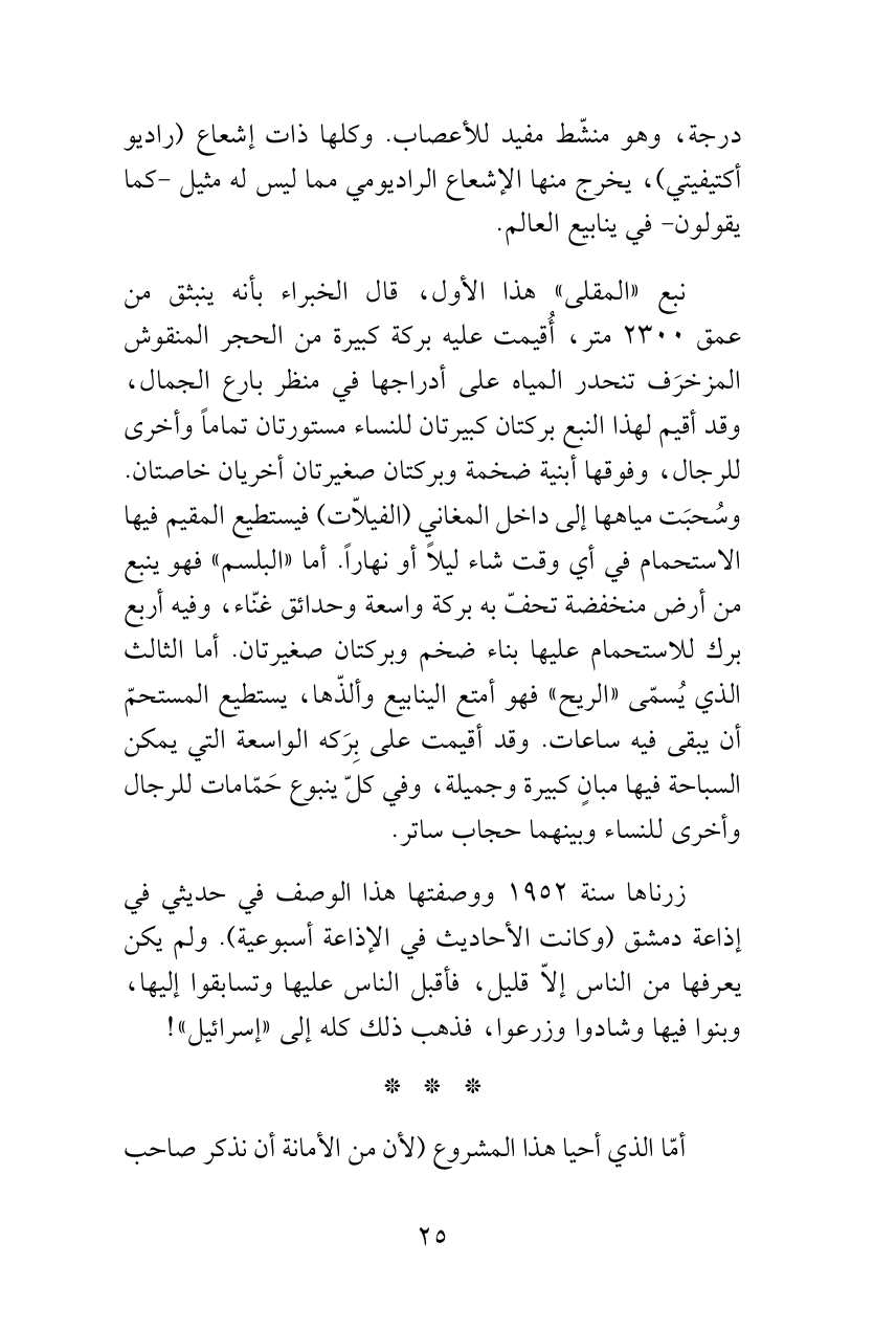 زرناها سنة 1952 ووصفتها هذا الوصف في حديثي في إذاعة دمشق (وكانت الأحاديث في الإذاعة أسبوعية). ولم يكن يعرفها من الناس إلاّ قليل، فأقبل الناس عليها وتسابقوا إليها، وبنوا فيها وشادوا وزرعوا، فذهب ذلك كله إلى «إسرائيل»!