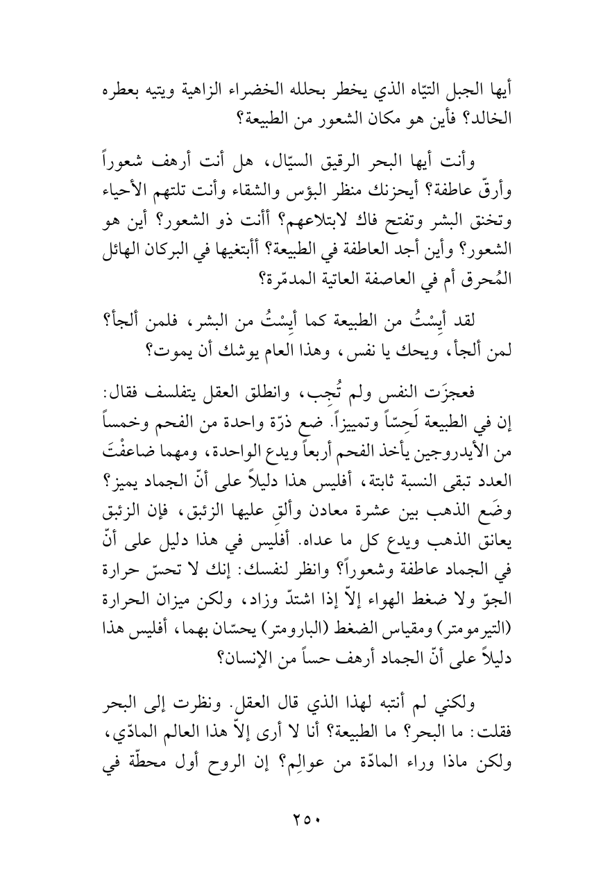 وأنت أيها البحر الرقيق السيّال، هل أنت أرهف شعوراً وأرقّ عاطفة؟ أيحزنك منظر البؤس والشقاء وأنت تلتهم الأحياء وتخنق البشر وتفتح فاك لابتلاعهم؟ أأنت ذو الشعور؟ أين هو الشعور؟ وأين أجد العاطفة في الطبيعة؟ أأبتغيها في البركان الهائل المُحرق أم في العاصفة العاتية المدمّرة؟