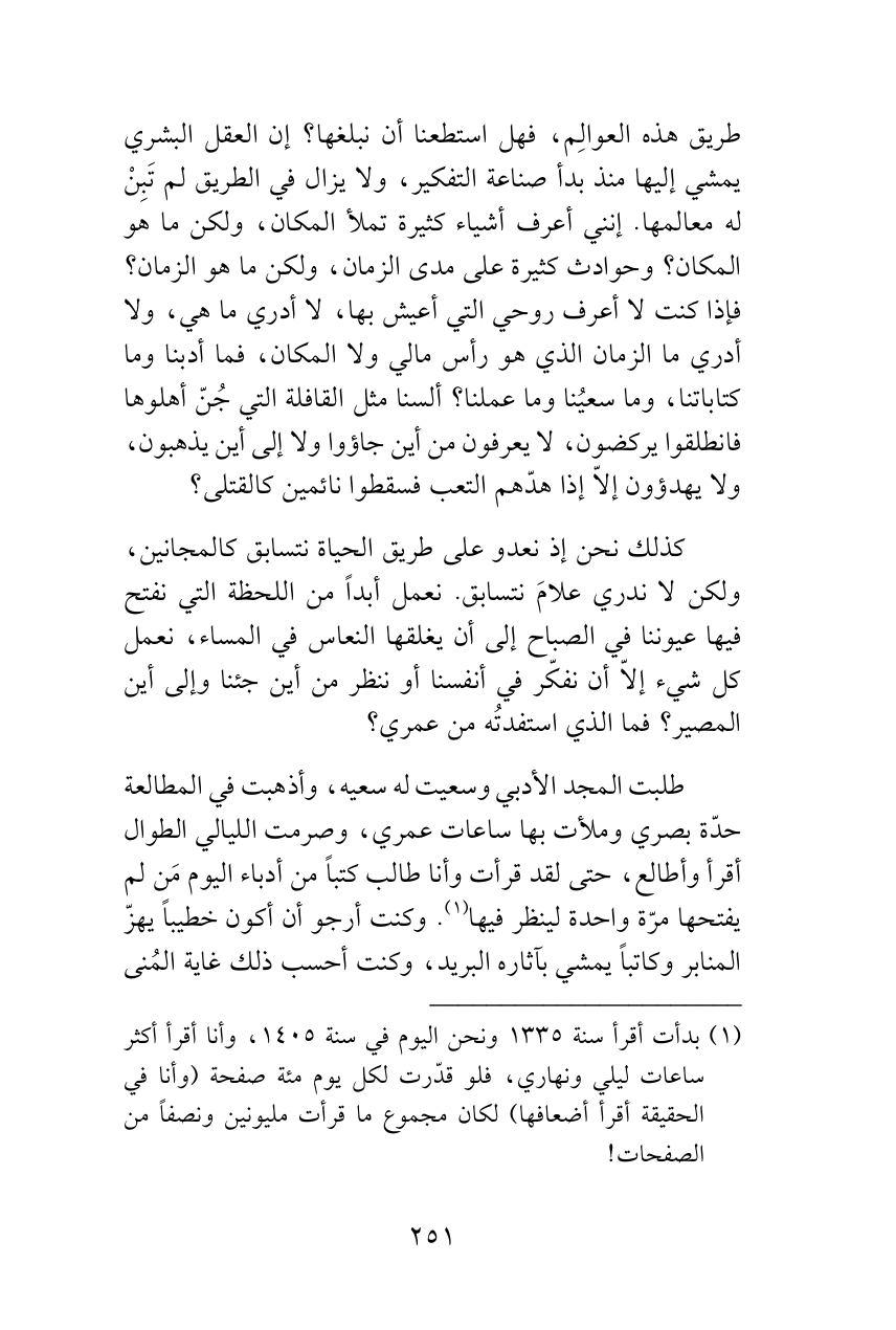 طريق هذه العوالِم، فهل استطعنا أن نبلغها؟ إن العقل البشري يمشي إليها منذ بدأ صناعة التفكير، ولا يزال في الطريق لم تَبِنْ له معالمها. إنني أعرف أشياء كثيرة تملأ المكان، ولكن ما هو المكان؟ وحوادث كثيرة على مدى الزمان، ولكن ما هو الزمان؟ فإذا كنت لا أعرف روحي التي أعيش بها، لا أدري ما هي، ولا أدري ما الزمان الذي هو رأس مالي ولا المكان، فما أدبنا وما كتاباتنا، وما سعيُنا وما عملنا؟ ألسنا مثل القافلة التي جُنّ أهلوها فانطلقوا يركضون، لا يعرفون من أين جاؤوا ولا إلى أين يذهبون، ولا يهدؤون إلاّ إذا هدّهم التعب فسقطوا نائمين كالقتلى؟