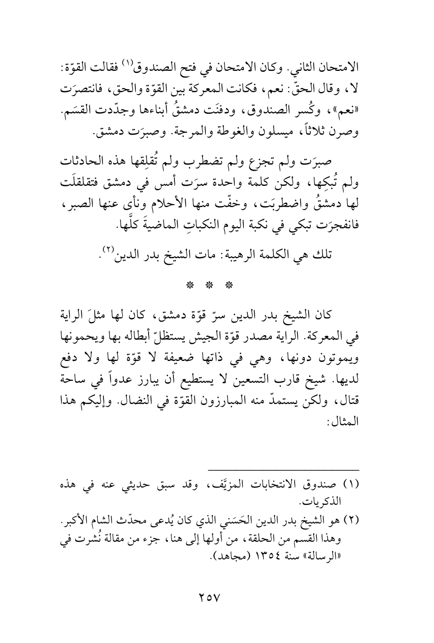 كان الشيخ بدر الدين سرّ قوّة دمشق، كان لها مثلَ الراية في المعركة. الراية مصدر قوّة الجيش يستظلّ أبطاله بها ويحمونها ويموتون دونها، وهي في ذاتها ضعيفة لا قوّة لها ولا دفع لديها. شيخ قارب التسعين لا يستطيع أن يبارز عدواً في ساحة قتال، ولكن يستمدّ منه المبارزون القوّة في النضال. وإليكم هذا المثال: