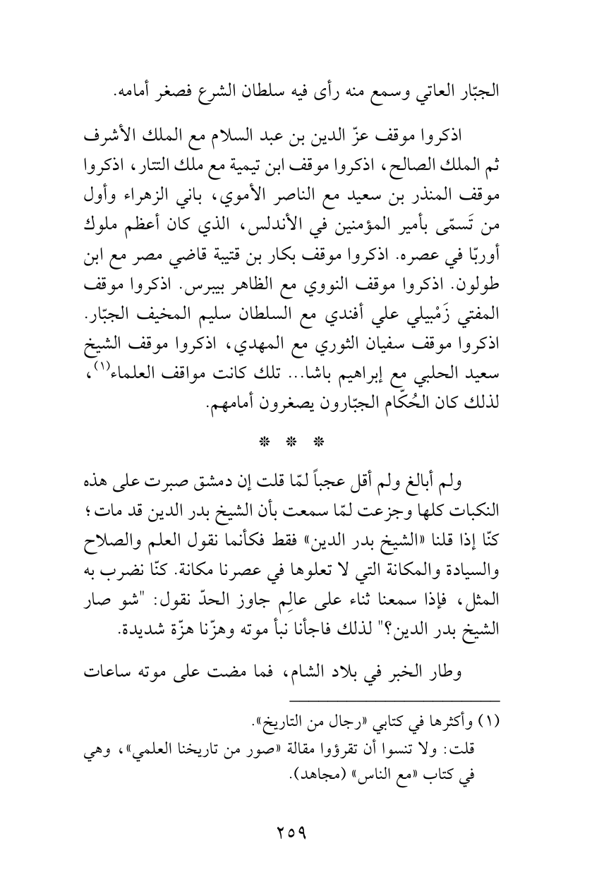 اذكروا موقف عزّ الدين بن عبد السلام مع الملك الأشرف ثم الملك الصالح، اذكروا موقف ابن تيمية مع ملك التتار، اذكروا موقف المنذر بن سعيد مع الناصر الأموي، باني الزهراء وأول من تَسمّى بأمير المؤمنين في الأندلس، الذي كان أعظم ملوك أوربّا في عصره. اذكروا موقف بكار بن قتيبة قاضي مصر مع ابن طولون. اذكروا موقف النووي مع الظاهر بيبرس. اذكروا موقف المفتي زَمْبيلي علي أفندي مع السلطان سليم المخيف الجبّار. اذكروا موقف سفيان الثوري مع المهدي، اذكروا موقف الشيخ سعيد الحلبي مع إبراهيم باشا ... تلك كانت مواقف العلماء (¬1)، لذلك كان الحُكّام الجبّارون يصغرون أمامهم.