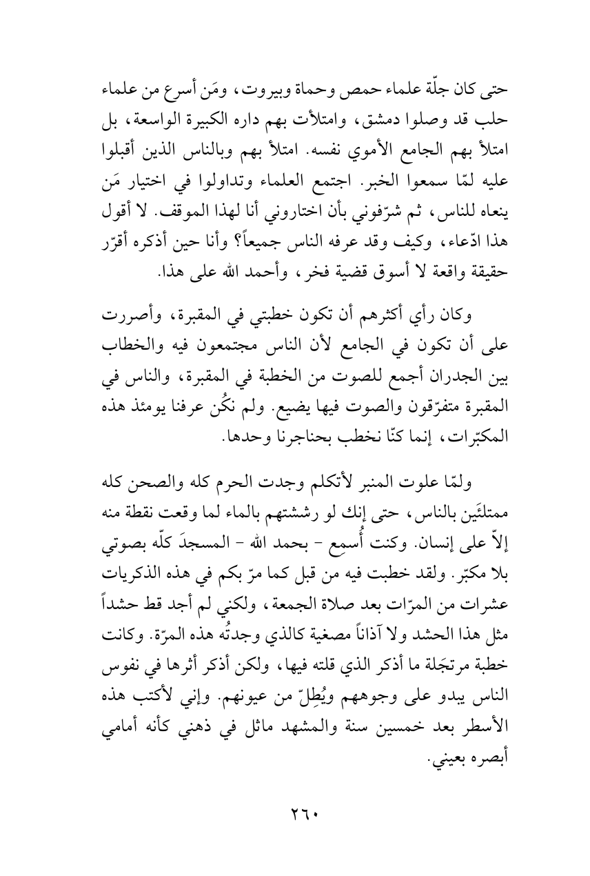 وكان رأي أكثرهم أن تكون خطبتي في المقبرة، وأصررت على أن تكون في الجامع لأن الناس مجتمعون فيه والخطاب بين الجدران أجمع للصوت من الخطبة في المقبرة، والناس في المقبرة متفرّقون والصوت فيها يضيع. ولم نكُن عرفنا يومئذ هذه المكبّرات، إنما كنّا نخطب بحناجرنا وحدها.