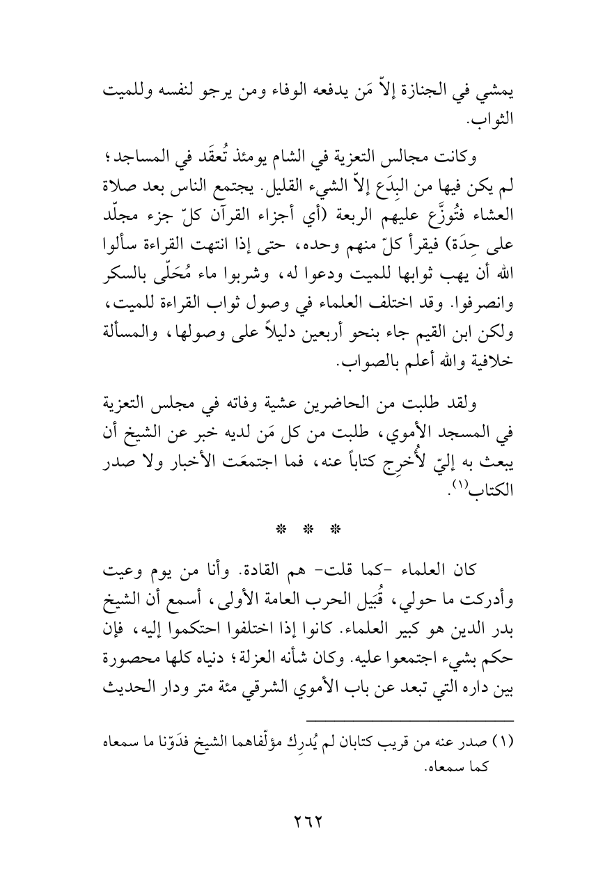 وكانت مجالس التعزية في الشام يومئذ تُعقَد في المساجد؛ لم يكن فيها من البِدَع إلاّ الشيء القليل. يجتمع الناس بعد صلاة العشاء فتُوزَّع عليهم الربعة (أي أجزاء القرآن كلّ جزء مجلّد على حِدَة) فيقرأ كلّ منهم وحده، حتى إذا انتهت القراءة سألوا الله أن يهب ثوابها للميت ودعوا له، وشربوا ماء مُحَلّى بالسكر وانصرفوا. وقد اختلف العلماء في وصول ثواب القراءة للميت، ولكن ابن القيم جاء بنحو أربعين دليلاً على وصولها، والمسألة خلافية والله أعلم بالصواب.