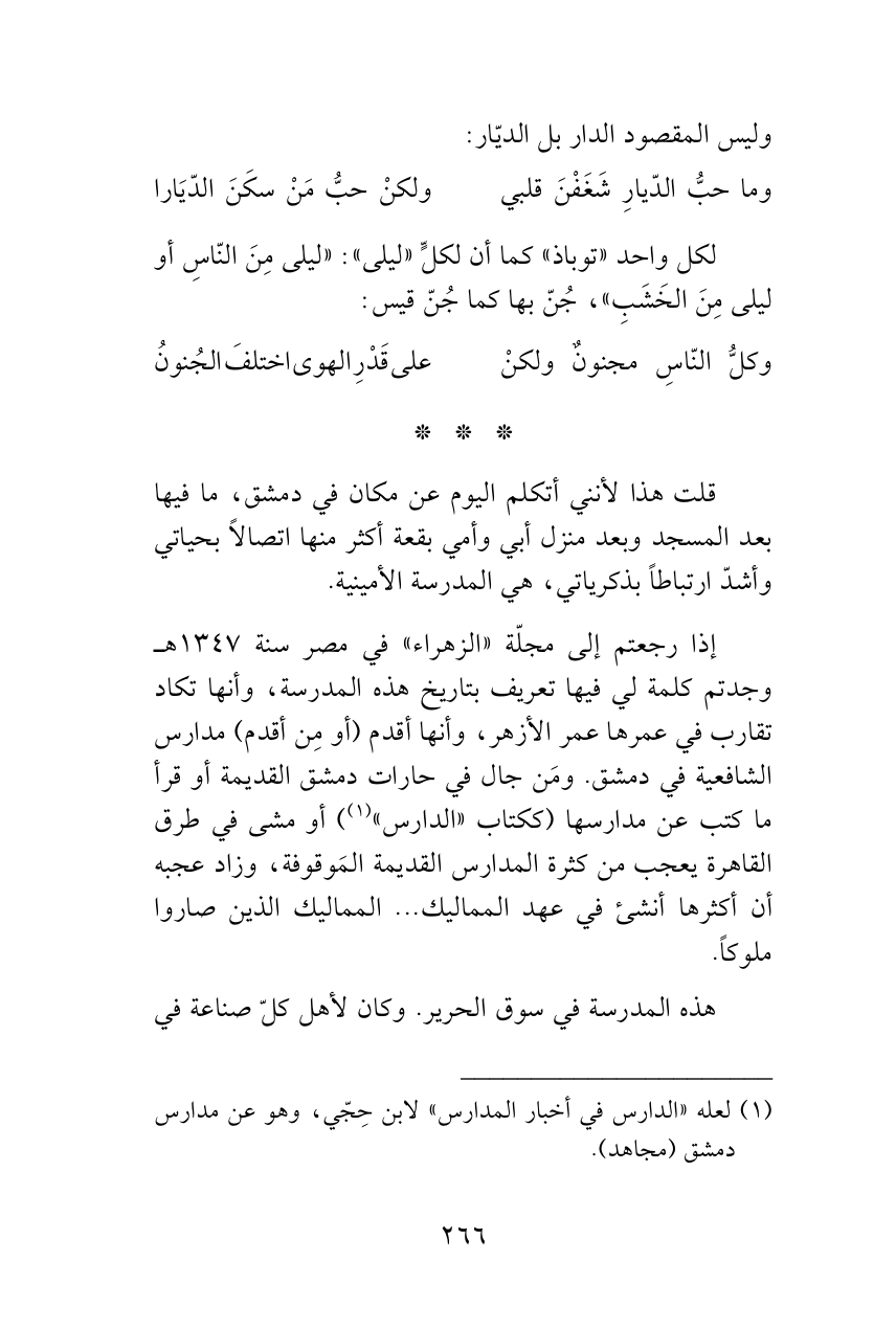 قلت هذا لأنني أتكلم اليوم عن مكان في دمشق، ما فيها بعد المسجد وبعد منزل أبي وأمي بقعة أكثر منها اتصالاً بحياتي وأشدّ ارتباطاً بذكرياتي، هي المدرسة الأمينية.